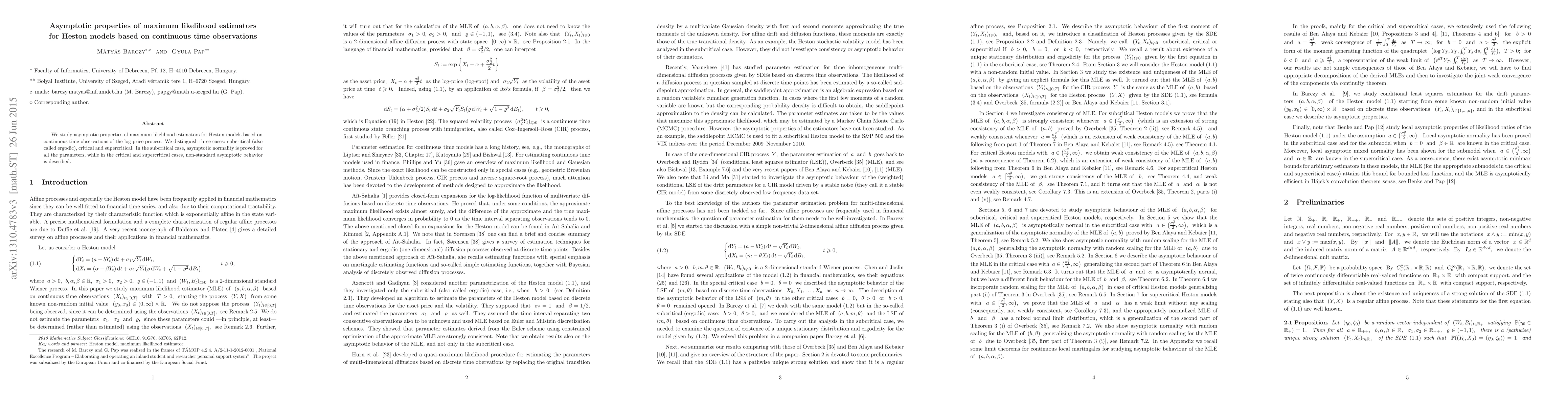 This paper investigates the asymptotic properties of maximum likelihood estimators for Heston models using continuous time observations. It proves asymptotic normality for parameters in the subcritical case, while describing non-standard asymptotic behavior for the critical and supercritical cases.