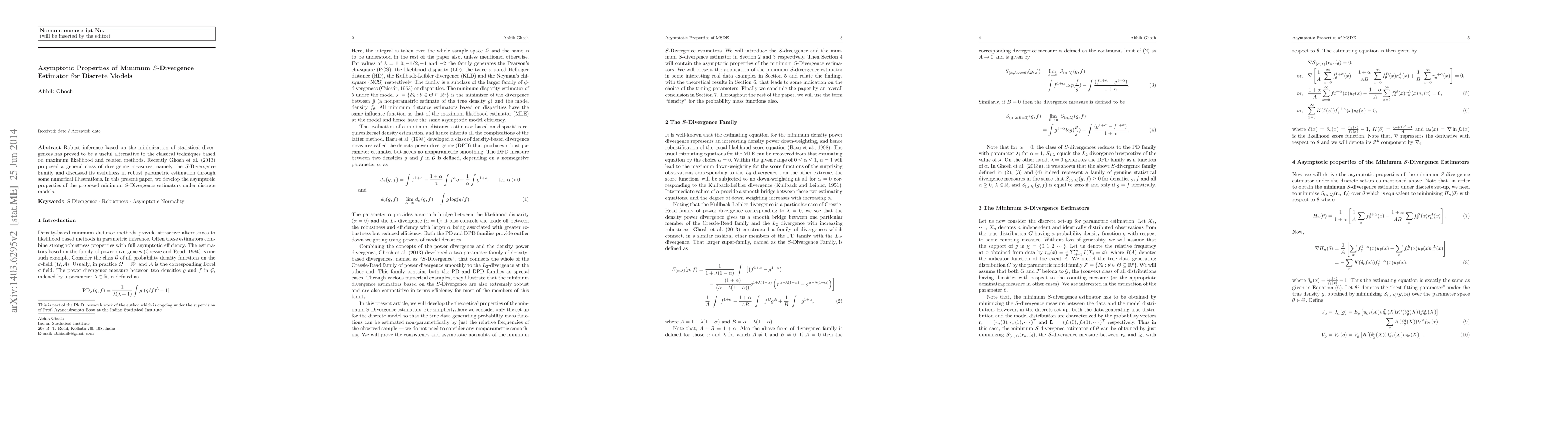 This paper investigates the asymptotic properties of minimum S-Divergence estimators for robust inference in discrete models, extending the work of Ghosh et al. (2013) on the S-Divergence Family and providing theoretical foundations for its use in parametric estimation.