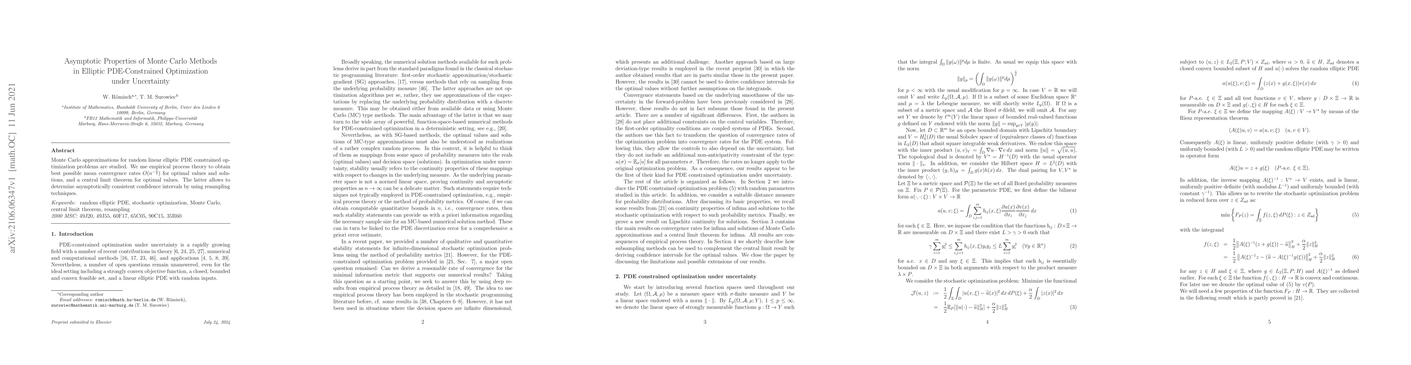 This research paper studies Monte Carlo methods for solving optimization problems with uncertainty in elliptic PDEs, achieving optimal convergence rates of $O(n^{-rac{1}{2}})$ for optimal values and solutions.