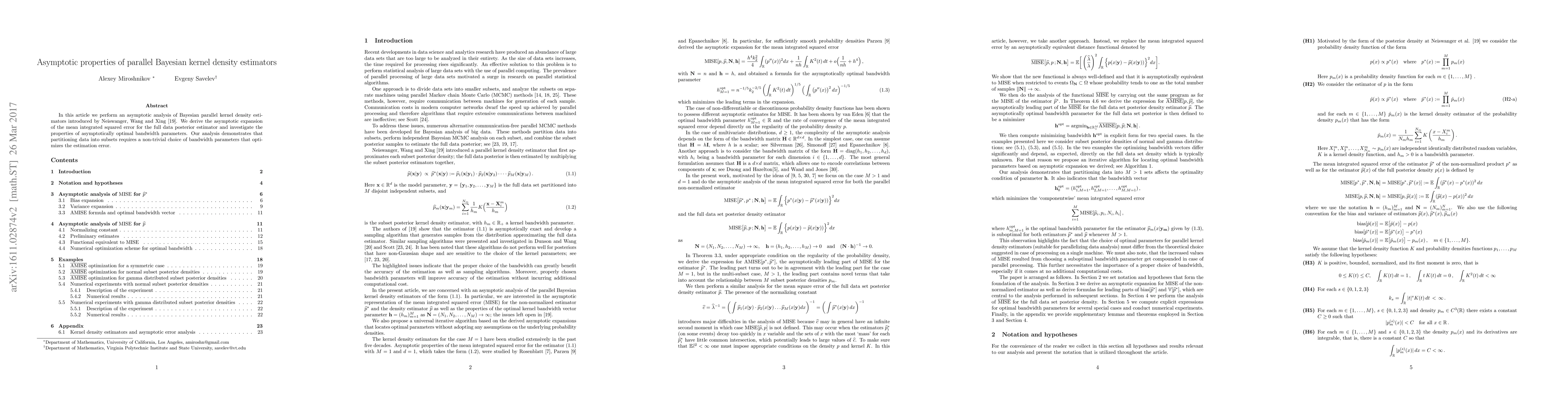This paper analyzes the asymptotic properties of Bayesian parallel kernel density estimators, deriving the mean integrated squared error expansion and exploring optimal bandwidth parameters for data partitioning to minimize estimation error. The findings highlight the importance of carefully selecting bandwidth parameters when using parallel approaches.