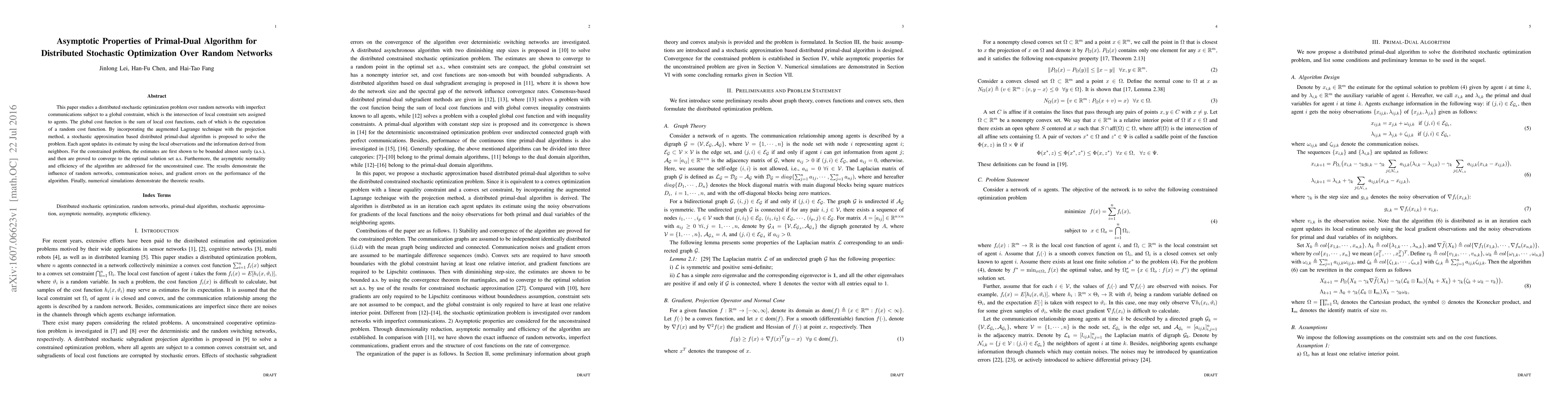 This paper proposes a distributed primal-dual algorithm for solving stochastic optimization problems over random networks, proving almost sure boundedness and convergence to the optimal solution set under constraints. It also addresses asymptotic normality and efficiency for the unconstrained case, demonstrating the algorithm's performance under various network conditions.