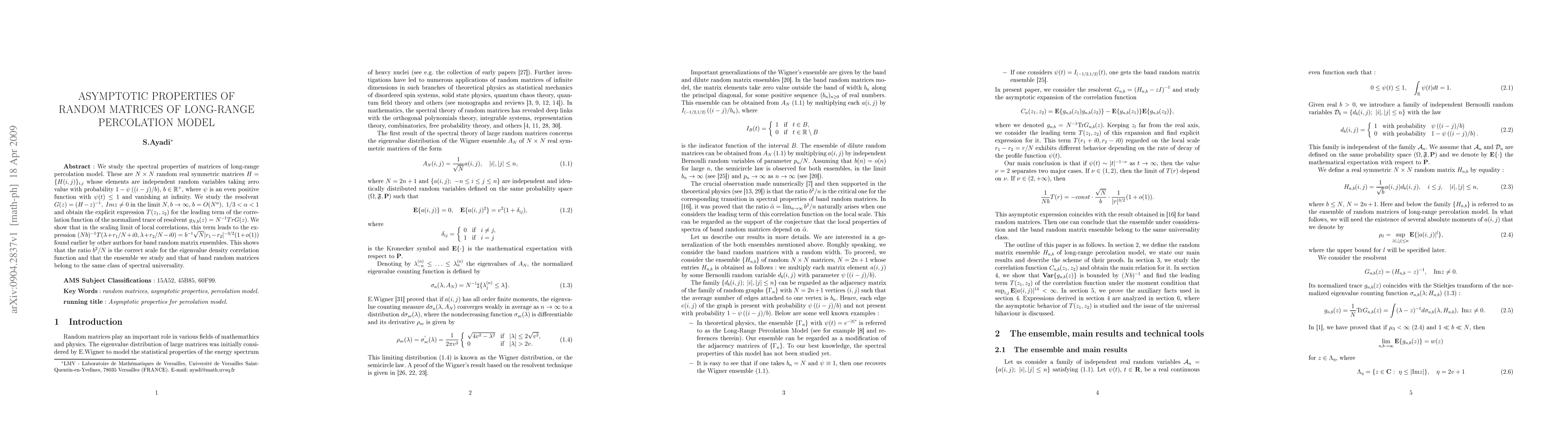 We study the spectral properties of matrices of long-range percolation model. These are N\times N random real symmetric matrices H=\{H(i,j)\}_{i,j} whose elements are independent random variables taking zero value with probability 1-\psi((i-j)/b), b\in \mathbb{R}^{+}, where $\psi$ is an even positive function with \psi(t)\le{1} and vanishing at infinity. We study the resolvent G(z)=(H-z)^{-1}, Imz\neq{0} in the limit N,b\to\infty, b=O(N^{\alpha}), 1/3<\alpha<1 and obtain the explicit expression T(z_{1},z_{2}) for the leading term of the correlation function of the normalized trace of resolvent g_{N,b}(z)=N^{-1}Tr G(z). We show that in the scaling limit of local correlations, this term leads to the expression (Nb)^{-1}T(\lambda+r_{1}/N+i0,\lambda+r_{2}/N-i0)= b^{-1}\sqrt{N}|r_{1}-r_{2}|^{-3/2}(1+o(1)) found earlier by other authors for band random matrix ensembles. This shows that the ratio $b^{2}/N$ is the correct scale for the eigenvalue density correlation function and that the ensemble we study and that of band random matrices belong to the same class of spectral universality.