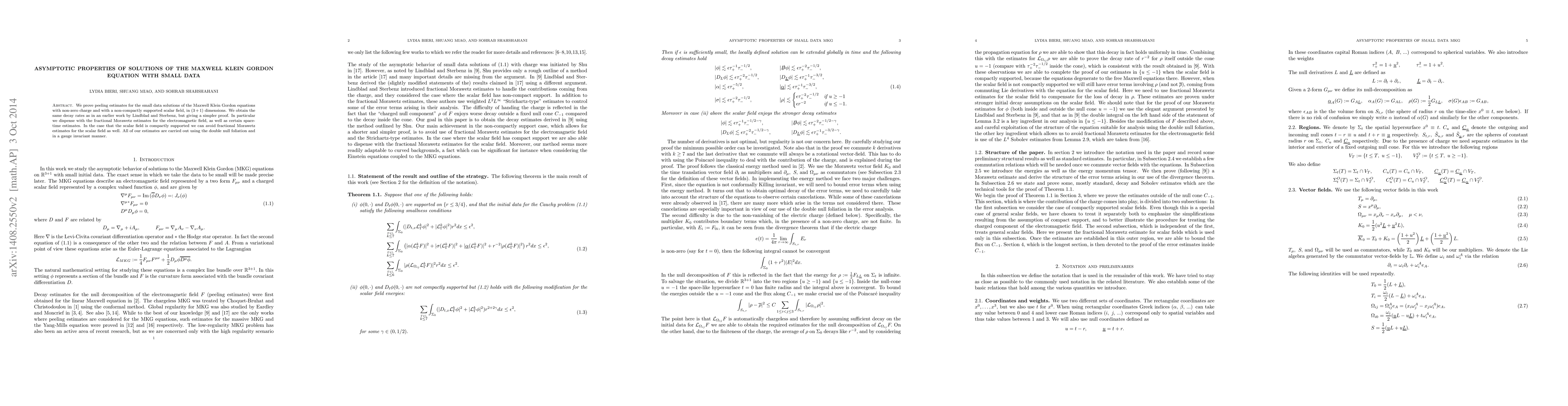 We prove peeling estimates for the small data solutions of the Maxwell Klein Gordon equations with non-zero charge and with a non-compactly supported scalar field, in $(3+1)$ dimensions. We obtain the same decay rates as in an earlier work by Lindblad and Sterbenz, but giving a simpler proof. In particular we dispense with the fractional Morawetz estimates for the electromagnetic field, as well as certain space-time estimates. In the case that the scalar field is compactly supported we can avoid fractional Morawetz estimates for the scalar field as well. All of our estimates are carried out using the double null foliation and in a gauge invariant manner.