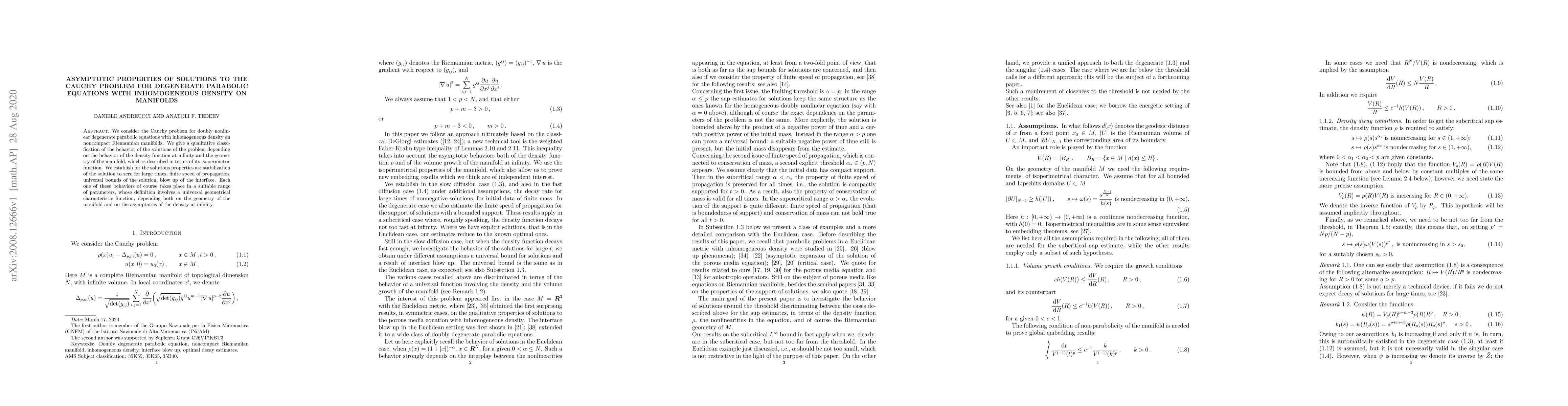 This paper studies the behavior of solutions to degenerate parabolic equations on manifolds, classifying their asymptotic properties based on density function at infinity and manifold geometry, finding stabilization, finite speed of propagation, universal bounds, and blow-up of the interface in specific parameter ranges.