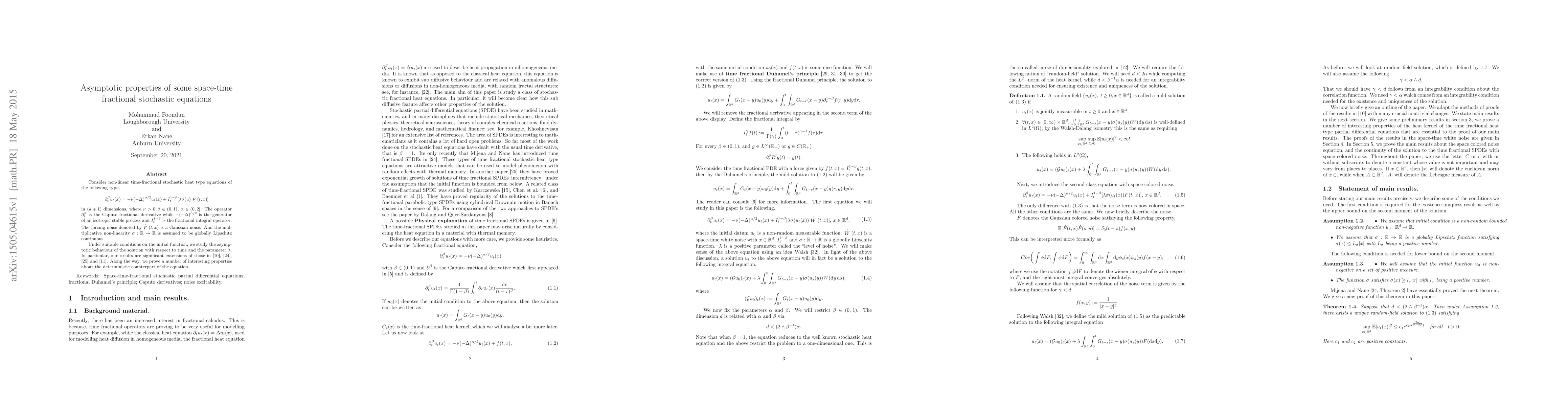 Consider non-linear time-fractional stochastic heat type equations of the following type, $$\partial^\beta_tu_t(x)=-\nu(-\Delta)^{\alpha/2} u_t(x)+I^{1-\beta}_t[\lambda \sigma(u)\stackrel{\cdot}{F}(t,x)]$$ in $(d+1)$ dimensions, where $\nu>0, \beta\in (0,1)$, $\alpha\in (0,2]$. The operator $\partial^\beta_t$ is the Caputo fractional derivative while $-(-\Delta)^{\alpha/2} $ is the generator of an isotropic stable process and $I^{1-\beta}_t$ is the fractional integral operator. The forcing noise denoted by $\stackrel{\cdot}{F}(t,x)$ is a Gaussian noise. And the multiplicative non-linearity $\sigma$ is assumed to be globally Lipschitz continuous. Under suitable conditions on the initial function, we study the asymptotic behaviour of the solution with respect to time and the parameter $\lambda$. In particular, our results are significant extensions of existing results. Along the way, we prove a number of interesting properties about the deterministic counterpart of the equation.