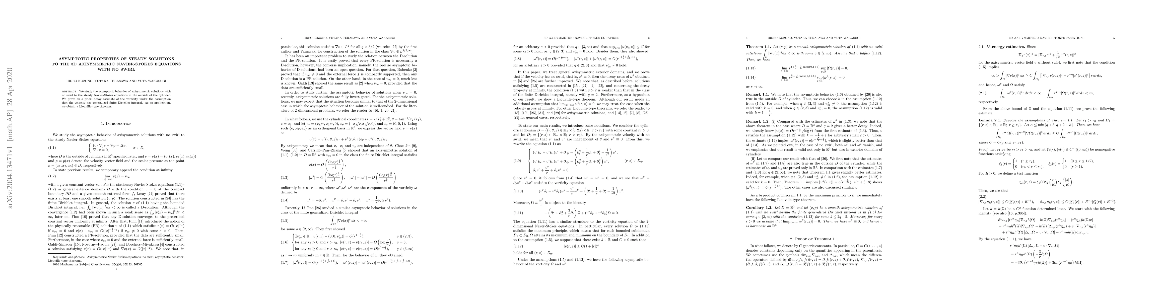 This paper investigates the asymptotic behavior of axisymmetric, non-swirling solutions to the 3D Navier-Stokes equations, proving a decay estimate for vorticity under certain velocity conditions. The study also leads to a Liouville-type result.