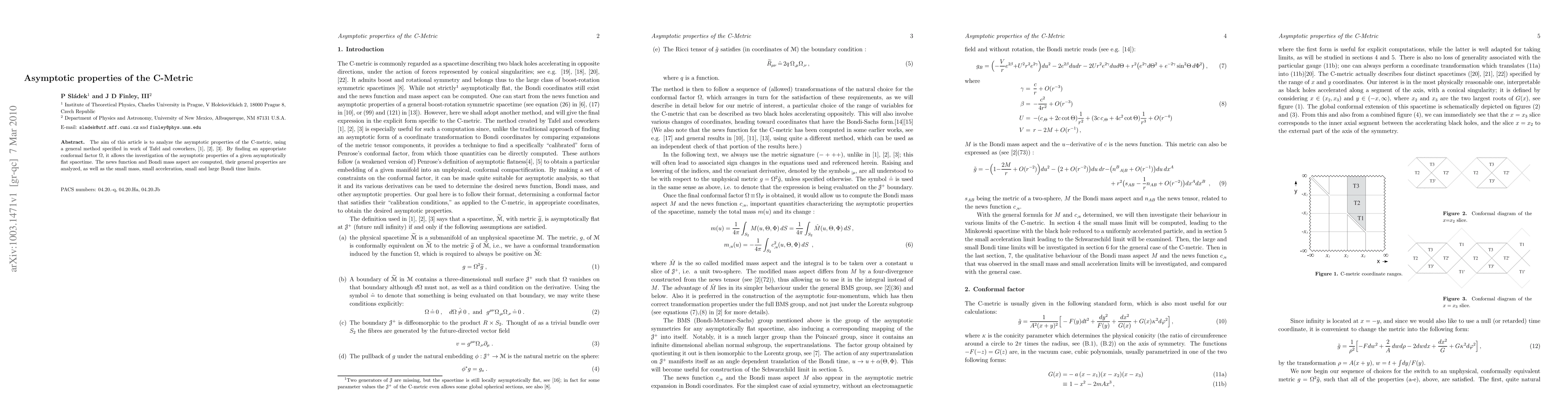 The aim of this article is to analyze the asymptotic properties of the C-metric, using a general method specified in work of Tafel and coworkers, [1], [2], [3]. By finding an appropriate conformal factor $\Omega$, it allows the investigation of the asymptotic properties of a given asymptotically flat spacetime. The news function and Bondi mass aspect are computed, their general properties are analyzed, as well as the small mass, small acceleration, small and large Bondi time limits.
