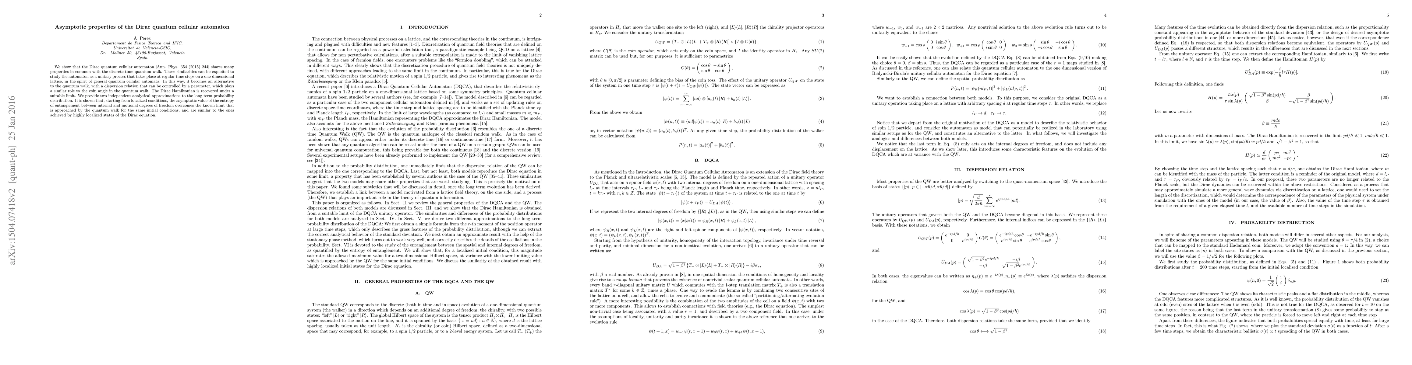 This paper investigates the Dirac quantum cellular automaton, demonstrating its similarities to discrete-time quantum walks and providing analytical approximations for its long-term probability distribution. It shows that the automaton's entropy of entanglement surpasses that of quantum walks, approaching values seen in highly localized Dirac states.