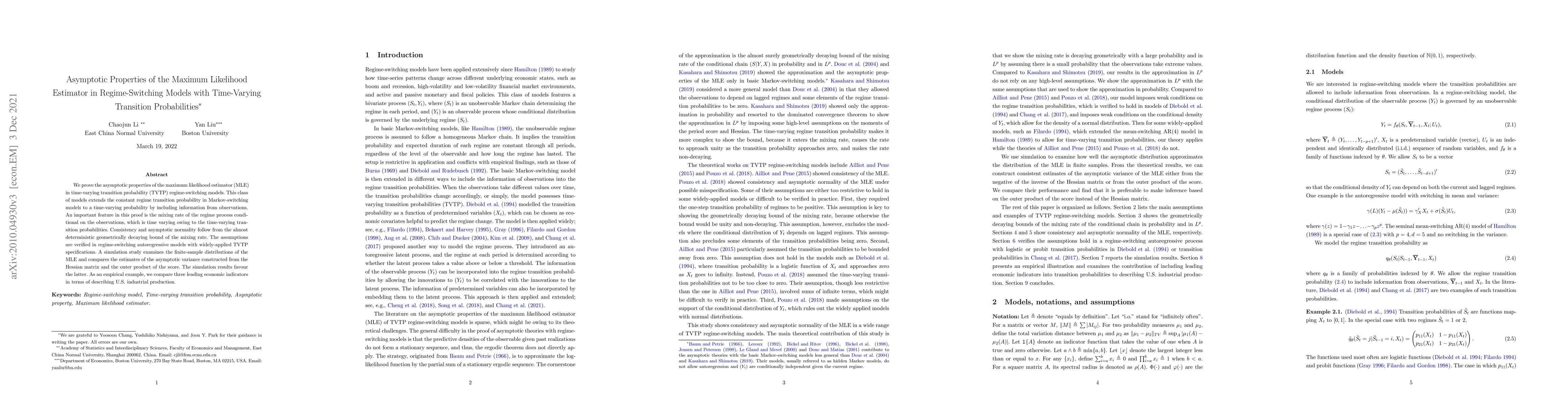This paper investigates the asymptotic properties of the maximum likelihood estimator in regime-switching models with time-varying transition probabilities, proving consistency and asymptotic normality. Simulation results show that the outer product of the score provides a better estimate of the asymptotic variance compared to the Hessian matrix.