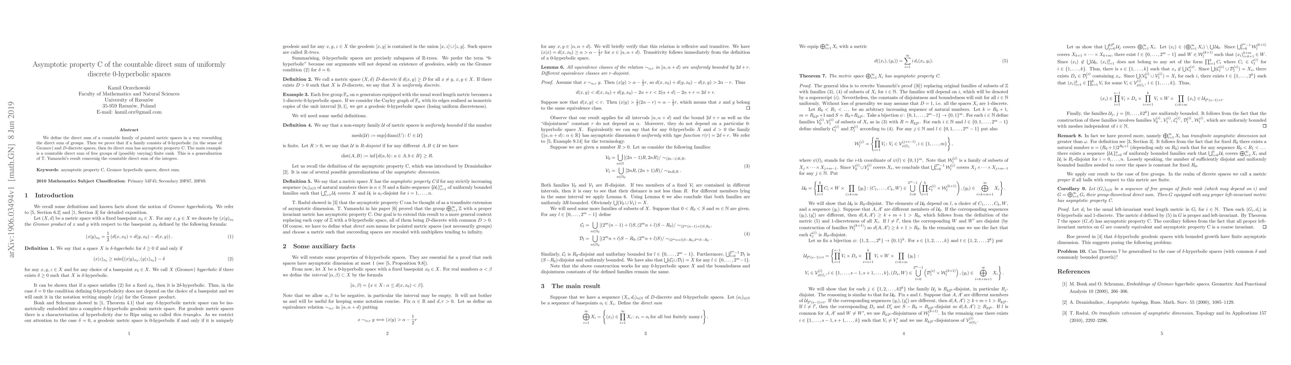 The paper defines the direct sum of a countable family of pointed metric spaces and proves that if a family consists of 0-hyperbolic and D-discrete spaces, then their direct sum has asymptotic property C.