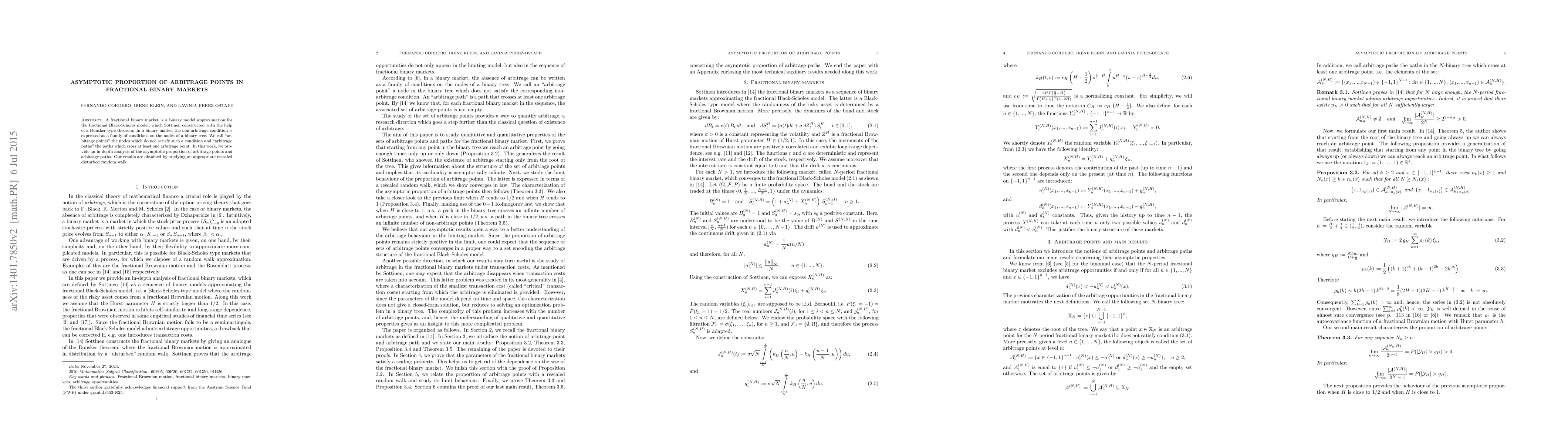 This paper investigates the asymptotic proportion of arbitrage points in fractional binary markets, demonstrating that there are infinitely many arbitrage points in the limit. It shows that paths in the binary tree cross an infinite number of arbitrage points when the fractional parameter $H$ is close to $1$, leading to an asymptotic proportion of arbitrage paths equal to $1$.