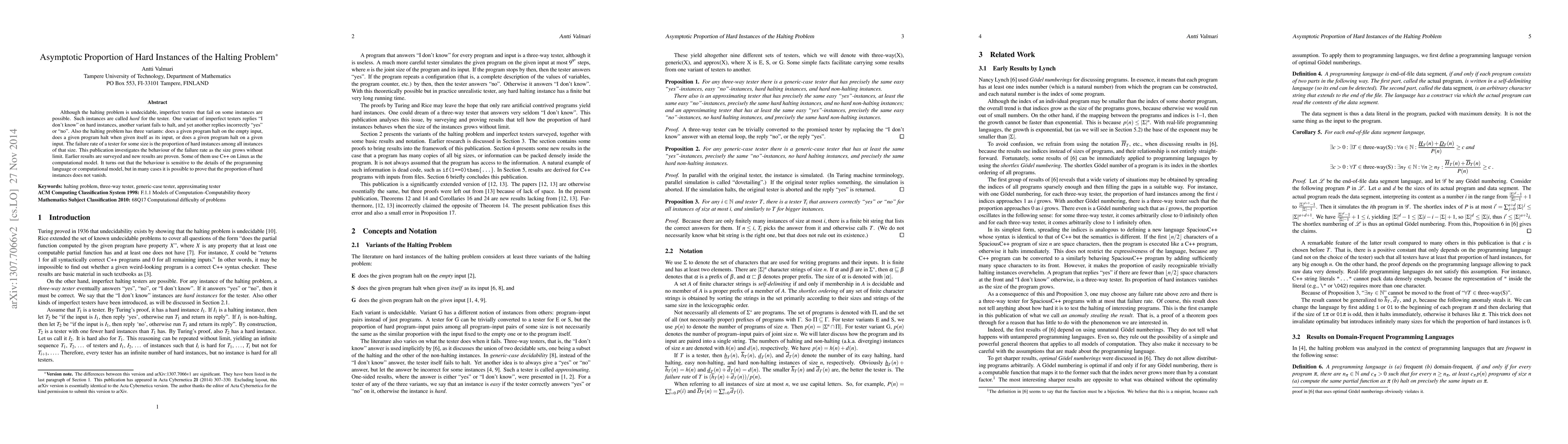 This paper examines the asymptotic behavior of hard instances for various imperfect testers of the halting problem, revealing that the failure rate does not vanish as program size increases, depending on the computational model used. The study combines survey of prior results with new proofs, demonstrating the sensitivity of the failure rate to programming language specifics.