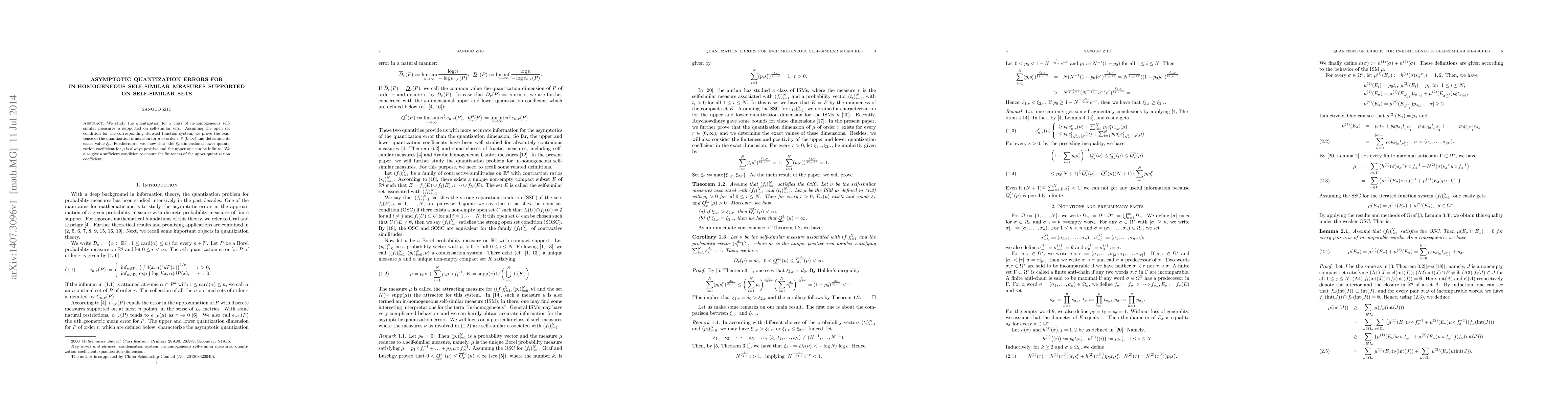 This paper investigates the quantization errors for in-homogeneous self-similar measures supported on self-similar sets, proving the existence and exact value of the quantization dimension under the open set condition. It also establishes that the lower quantization coefficient is always positive, while the upper coefficient can be infinite, with a condition provided for its finiteness.