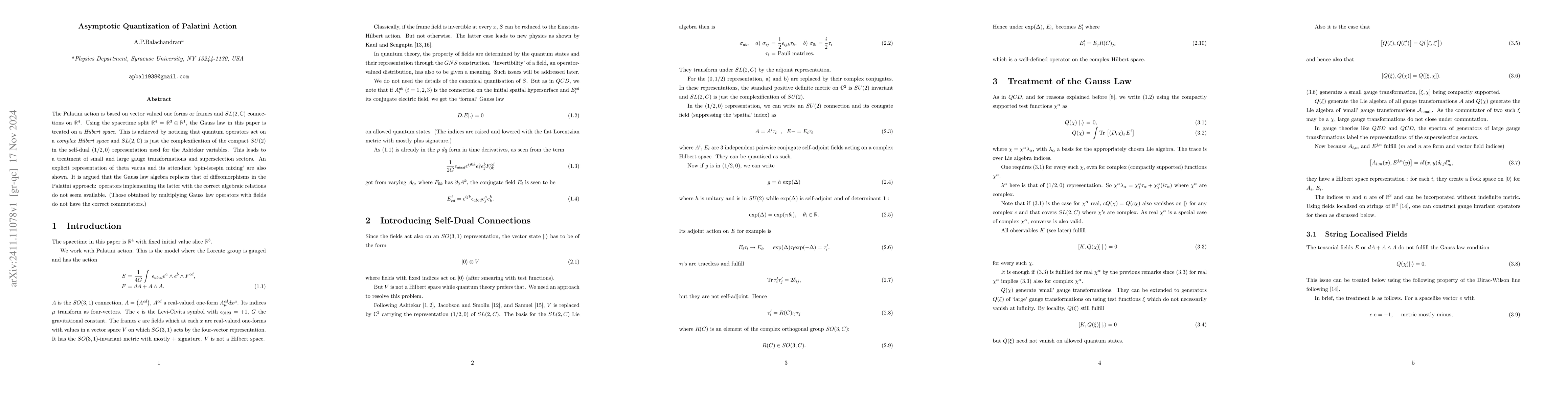 This paper explores the asymptotic quantization of the Palatini action using vector-valued one forms and SL(2,C) connections, treating the Gauss law on a Hilbert space and showing how small and large gauge transformations and superselection sectors can be managed. It concludes that the Gauss law algebra effectively replaces the role of diffeomorphisms in the Palatini approach.