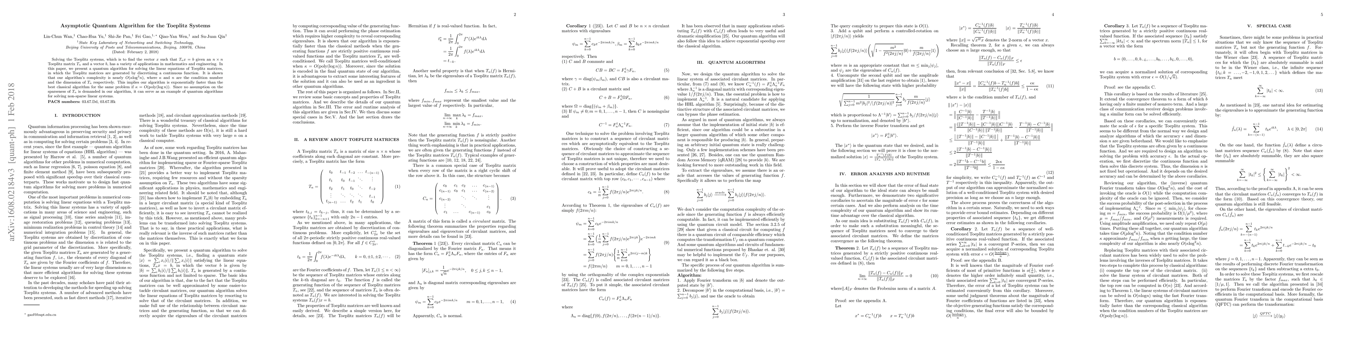 A new quantum algorithm solves Toeplitz systems exponentially faster than classical algorithms for certain cases, with a complexity of O(kappa log^2 n), where kappa is the condition number of the matrix.