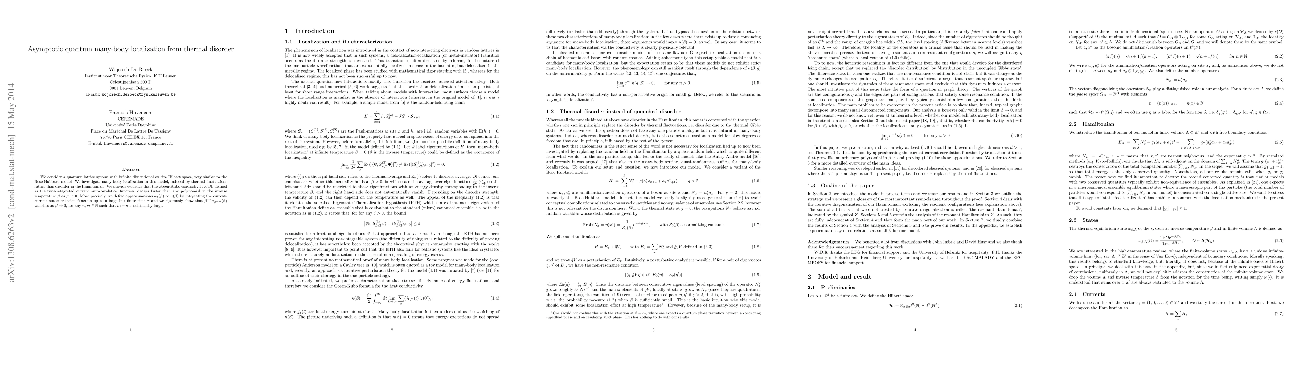 This research demonstrates that quantum many-body localization can occur due to thermal disorder, not just Hamiltonian disorder. It rigorously proves that the Green-Kubo conductivity decays faster than any polynomial in inverse temperature as it approaches zero.