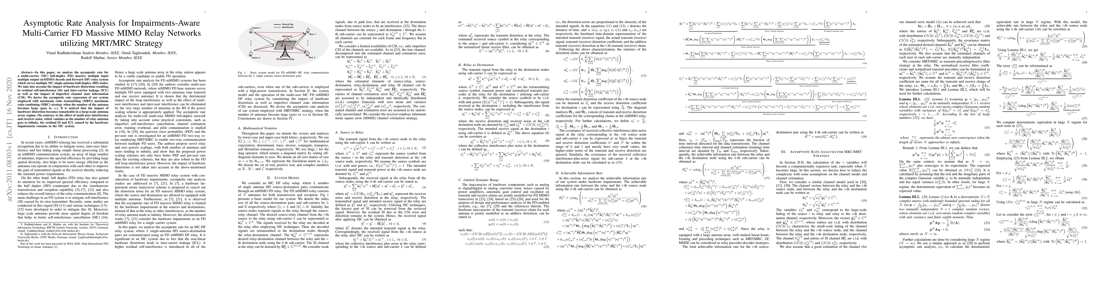 This paper analyzes the asymptotic rate for a multi-carrier full-duplex mMIMO relay system, considering hardware distortions and imperfect channel state information. It finds that while multi-user interference and noise diminish with more antennas, residual self-interference and inter-carrier leakage persist due to hardware impairments.