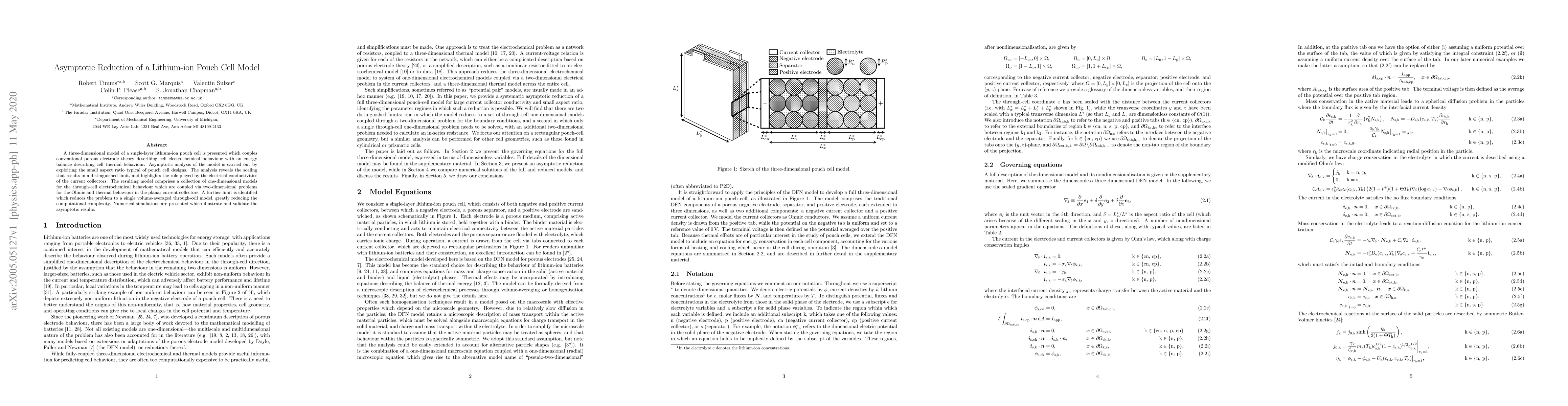 A three-dimensional model of a single-layer lithium-ion pouch cell is presented which couples conventional porous electrode theory describing cell electrochemical behaviour with an energy balance describing cell thermal behaviour. Asymptotic analysis of the model is carried out by exploiting the small aspect ratio typical of pouch cell designs. The analysis reveals the scaling that results in a distinguished limit, and highlights the role played by the electrical conductivities of the current collectors. The resulting model comprises a collection of one-dimensional models for the through-cell electrochemical behaviour which are coupled via two-dimensional problems for the Ohmic and thermal behaviour in the planar current collectors. A further limit is identified which reduces the problem to a single volume-averaged through-cell model, greatly reducing the computational complexity. Numerical simulations are presented which illustrate and validate the asymptotic results.