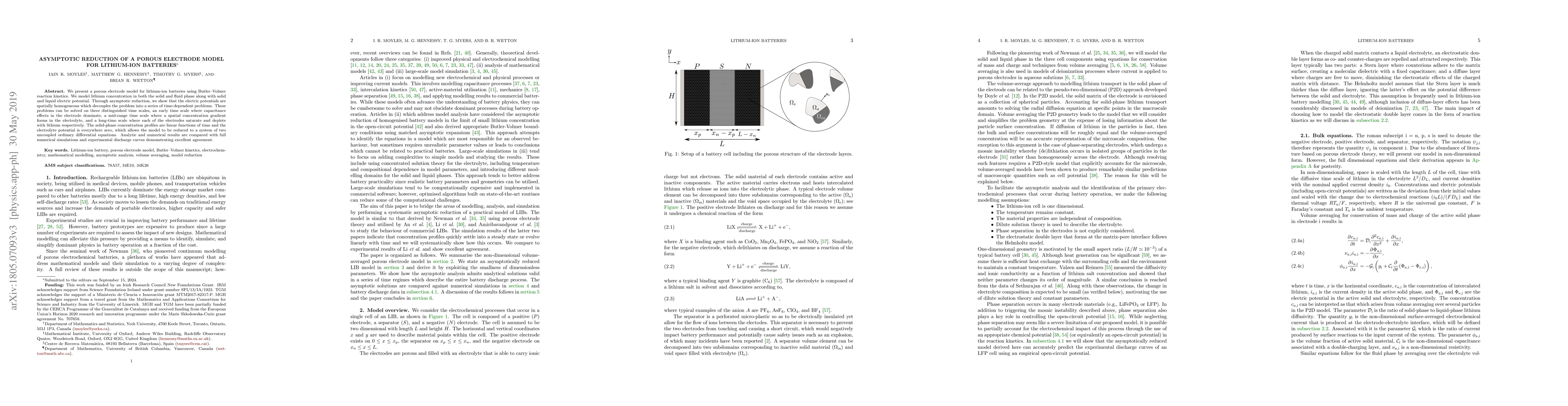 This paper develops a porous electrode model for lithium-ion batteries using Butler-Volmer kinetics, showing through asymptotic reduction that the electric potentials are spatially homogeneous, leading to a simplified system of two uncoupled ordinary differential equations that accurately match full simulations and experimental data.
