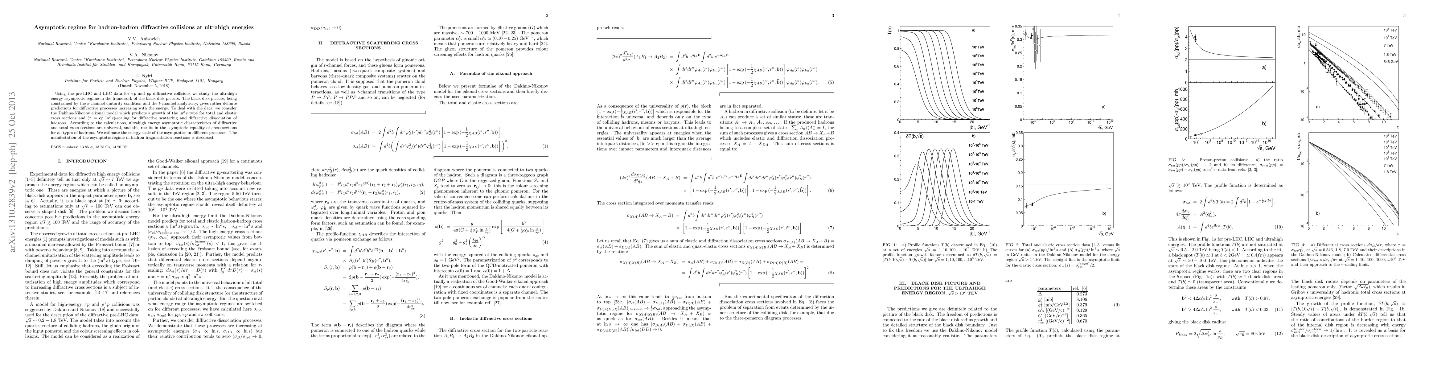 Using the pre-LHC and LHC data for $\pi p$ and $pp$ diffractive collisions we study the ultrahigh energy asymptotic regime in the framework of the black disk picture. The black disk picture, being constrained by the s-channel unitarity condition and the $t$-channel analyticity, gives rather definite predictions for diffractive processes increasing with the energy. To deal with the data, we consider the Dakhno-Nikonov eikonal model which predicts a growth of the $\ln^2s$ type for total and elastic cross sections and $(\tau={\bf q}_\perp^2\ln^2s)$-scaling for diffractive scattering and diffractive dissociation of hadrons. According to the calculations, ultrahigh energy asymptotic characteristics of diffractive and total cross sections are universal, and this results in the asymptotic equality of cross sections for all types of hadrons. We estimate the energy scale of the asymptotics in different processes. The manifestation of the asymptotic regime in hadron fragmentation reactions is discussed.