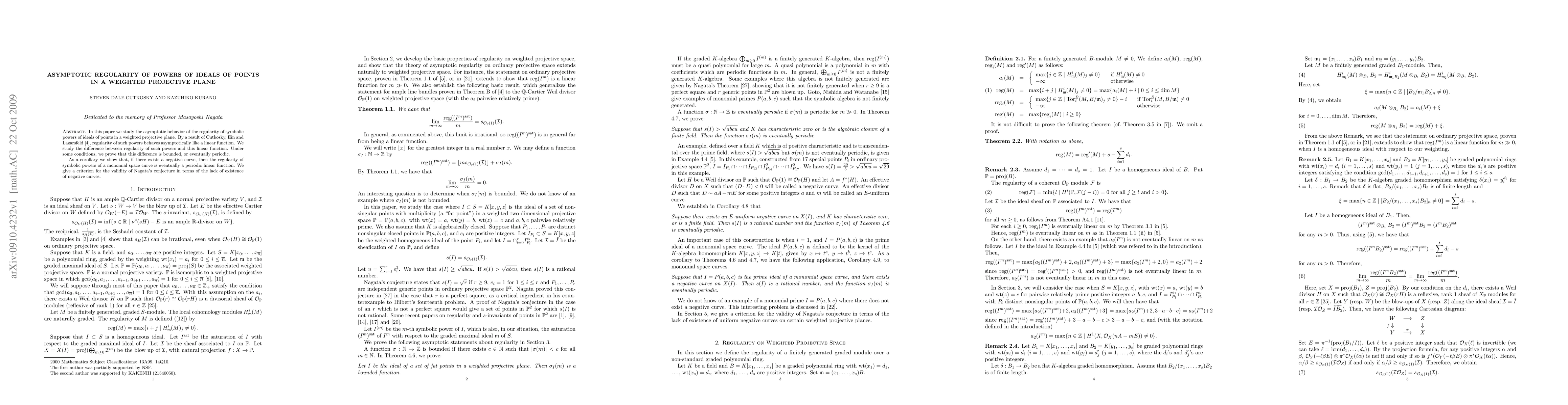 In this paper we study the asymptotic behavior of the regularity of symbolic powers of ideals of points in a weighted projective plane. By a result of Cutkosky, Ein and Lazarsfeld, regularity of such powers behaves asymptotically like a linear function. We study the difference between regularity of such powers and this linear function. Under some conditions, we prove that this difference is bounded, or eventually periodic. As a corollary we show that, if there exists a negative curve, then the regularity of symbolic powers of a monomial space curve is eventually a periodic linear function. We give a criterion for the validity of Nagata's conjecture in terms of the lack of existence of negative curves.