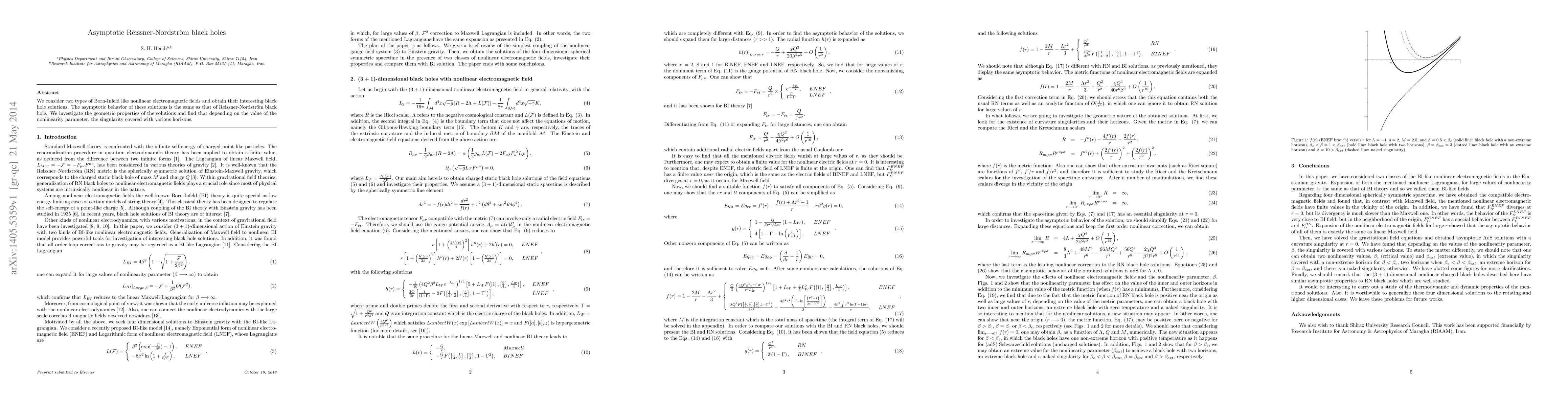 We consider two types of Born-Infeld like nonlinear electromagnetic fields and obtain their interesting black hole solutions. The asymptotic behavior of these solutions is the same as that of Reissner-Nordstrom black hole. We investigate the geometric properties of the solutions and find that depending on the value of the nonlinearity parameter, the singularity covered with various horizons.