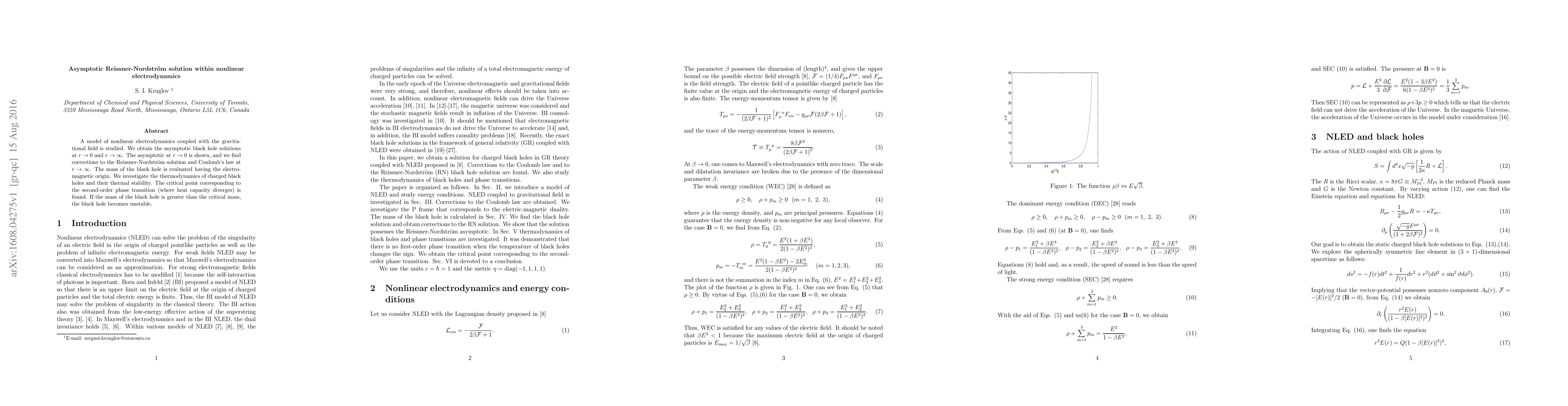 A model of nonlinear electrodynamics coupled with the gravitational field is studied. We obtain the asymptotic black hole solutions at $r\rightarrow 0$ and $r\rightarrow \infty$. The asymptotic at $r\rightarrow 0$ is shown, and we find corrections to the Reissner-Nordstr\"om solution and Coulomb's law at $r\rightarrow\infty$. The mass of the black hole is evaluated having the electromagnetic origin. We investigate the thermodynamics of charged black holes and their thermal stability. The critical point corresponding to the second-order phase transition (where heat capacity diverges) is found. If the mass of the black hole is greater than the critical mass, the black hole becomes unstable.