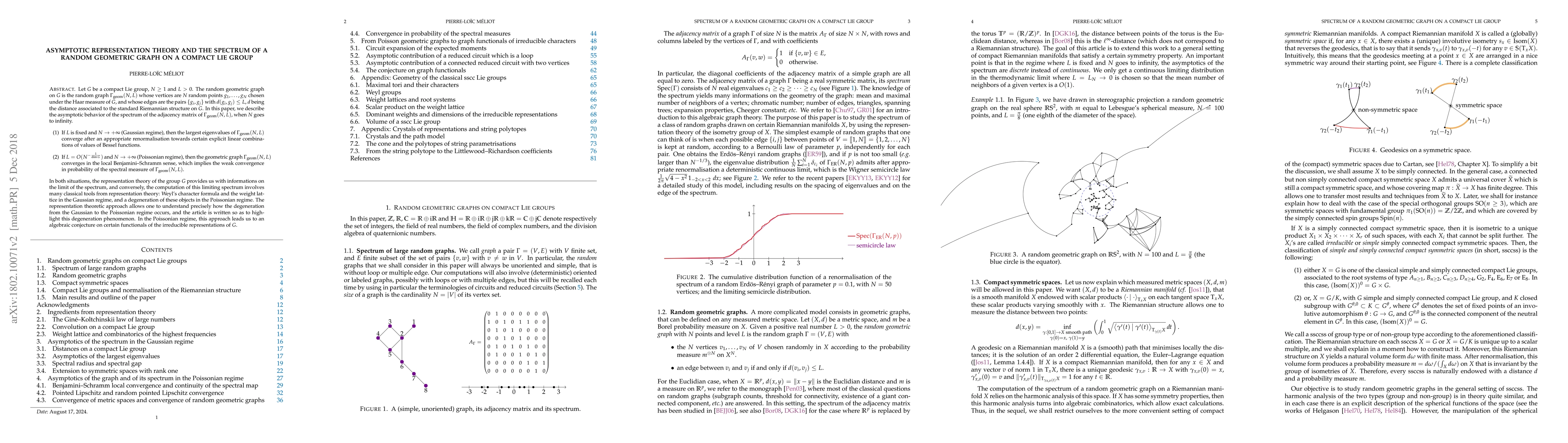 The paper studies the asymptotic behavior of a random geometric graph on a compact Lie group, finding that in large N, its largest eigenvalues converge to explicit linear combinations of Bessel functions or exhibit degeneration leading to an algebraic conjecture.