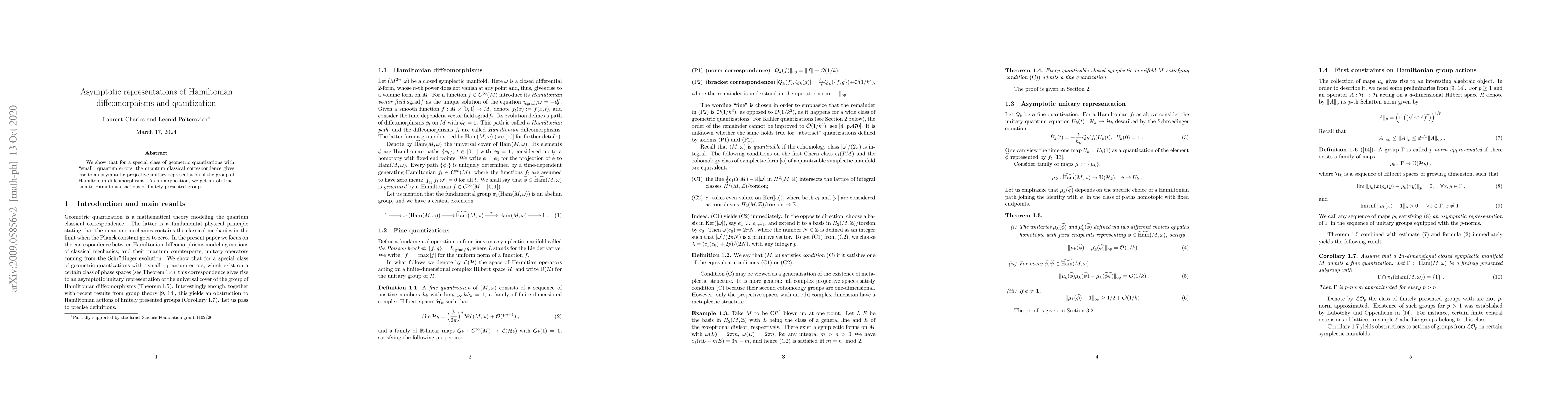 We show that for a special class of geometric quantizations with "small" quantum errors, the quantum classical correspondence gives rise to an asymptotic projective representation of the group of Hamiltonian diffeomorphisms. As an application, we get an obstruction to Hamiltonian actions of finitely presented groups.