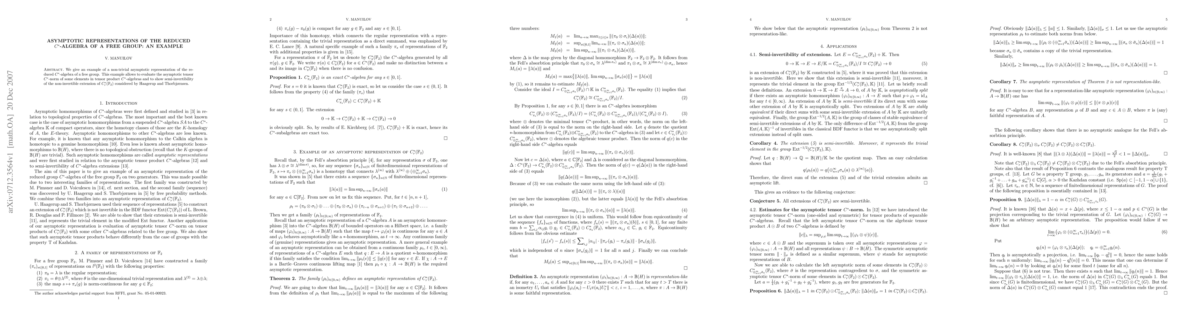 We give an example of a non-trivial asymptotic representation of the reduced C*-algebra of a free group. This example allows to evaluate the asymptotic tensor C*-norm of some elements in tensor product C*-algebras and to show semi-invertibility of the non-invertible extension of $C^*_r(\mathbb F_2)$ considered by Haagerup and Thorbjornsen.