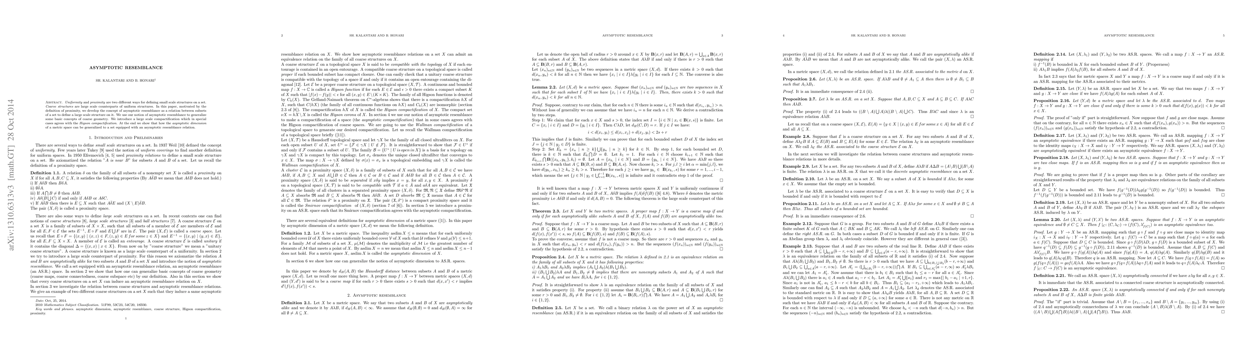 Uniformity and proximity are two different ways for defining small scale structures on a set. Coarse structures are large scale counterparts of uniform structures. In this paper, motivated by the definition of proximity, we develop the concept of asymptotic resemblance as a relation between subsets of a set to define a large scale structure on it. We use our notion of asymptotic resemblance to generalize some basic concepts of coarse geometry. We introduce a large scale compactification which in special cases agrees with Higson compactification. At the end we show that how the asymptotic dimension of a metric space can be generalized to a set equipped with an asymptotic resemblance relation.