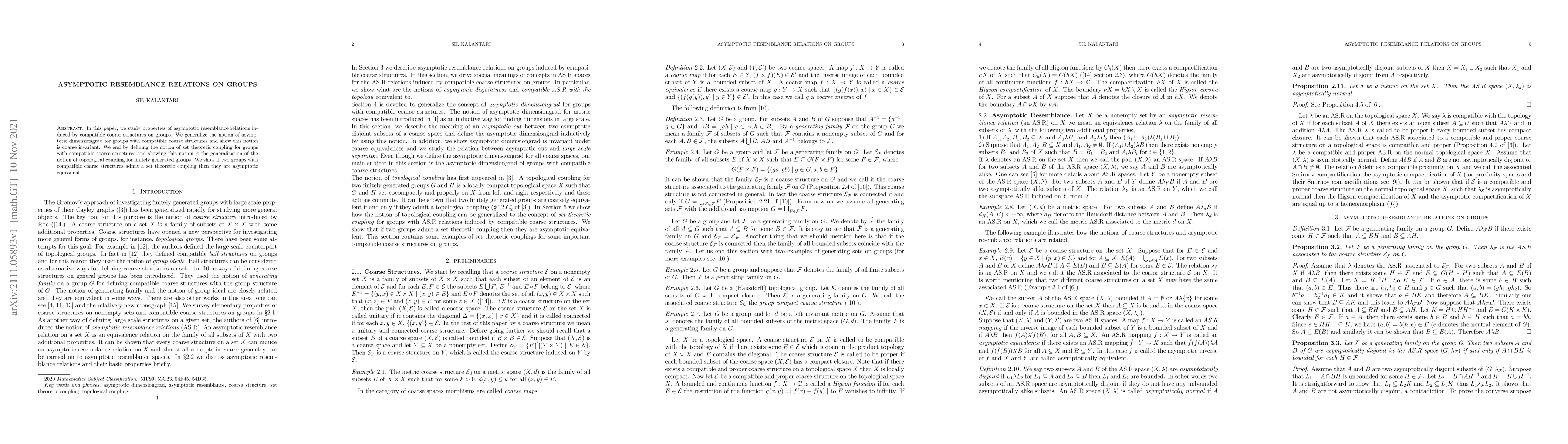 This paper explores asymptotic resemblance relations on groups via compatible coarse structures, generalizing the concept of asymptotic dimension and introducing set theoretic coupling, which generalizes topological coupling for finitely generated groups, proving asymptotic equivalence for coupled groups.
