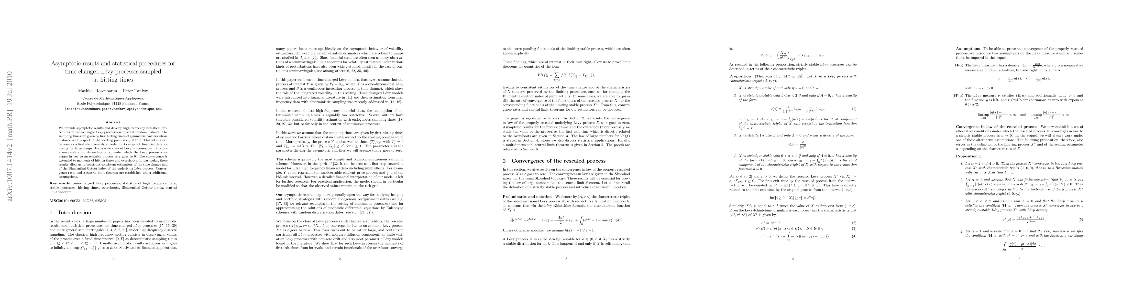 This paper provides asymptotic results and statistical procedures for time-changed Lévy processes sampled at random hitting times. It introduces a renormalization that leads to convergence to an α-stable process, allowing for the development of consistent estimators for the time change and the Blumenthal-Getoor index, with established convergence rates and a central limit theorem.