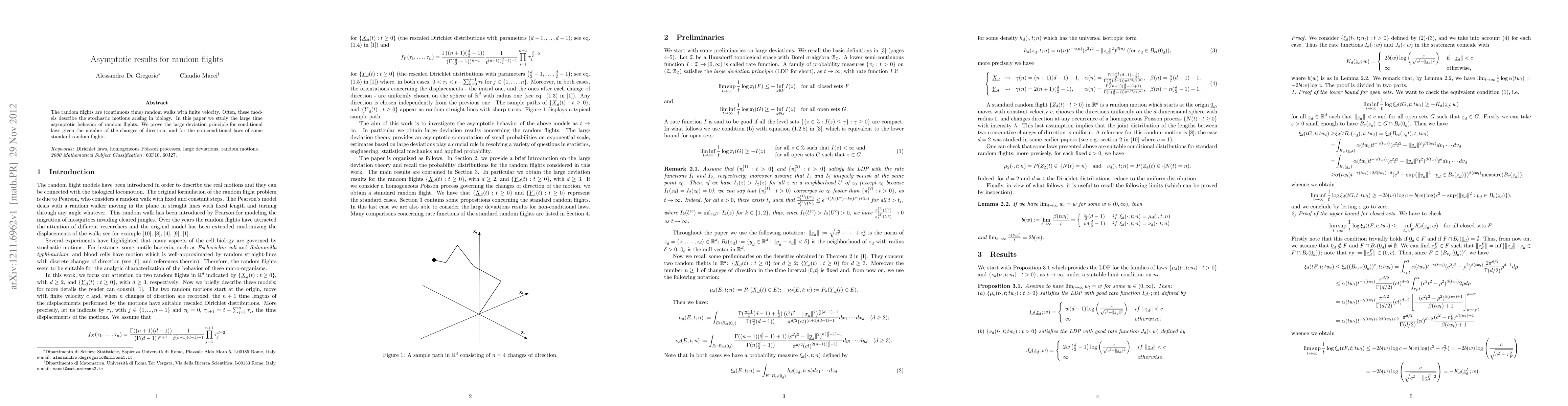 The random flights are (continuous time) random walkswith finite velocity. Often, these models describe the stochastic motions arising in biology. In this paper we study the large time asymptotic behavior of random flights. We prove the large deviation principle for conditional laws given the number of the changes of direction, and for the non-conditional laws of some standard random flights.
