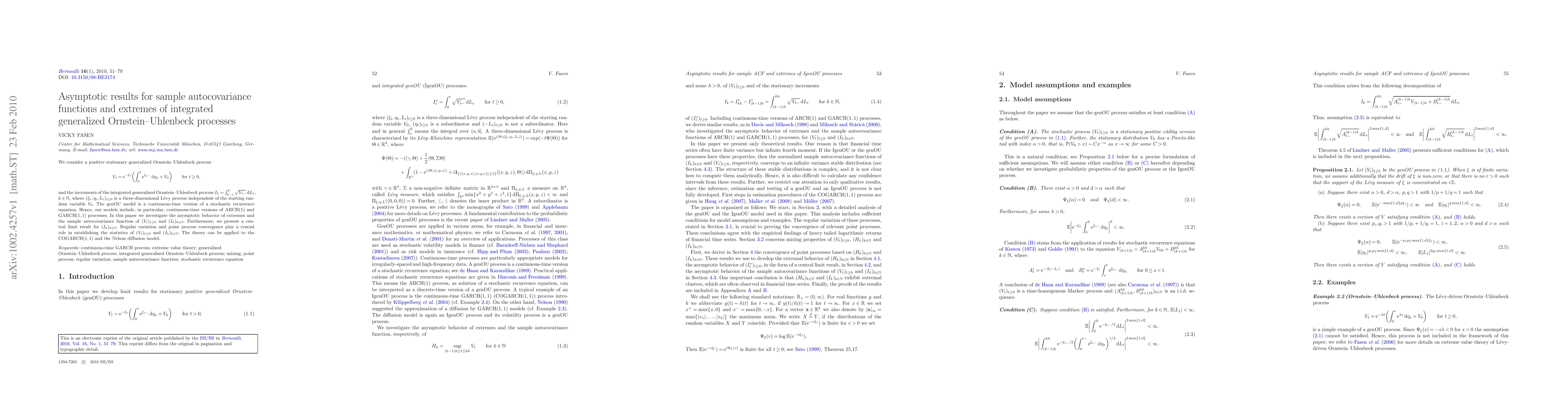 We consider a positive stationary generalized Ornstein--Uhlenbeck process \[V_t=\mathrm{e}^{-\xi_t}\biggl(\int_0^t\mathrm{e}^{\xi_{s-}}\ ,\mathrm{d}\eta_s+V_0\biggr)\qquadfor t\geq0,\] and the increments of the integrated generalized Ornstein--Uhlenbeck process $I_k=\int_{k-1}^k\sqrt{V_{t-}} \mathrm{d}L_t$, $k\in\mathbb{N}$, where $(\xi_t,\eta_t,L_t)_{t\geq0}$ is a three-dimensional L\'{e}vy process independent of the starting random variable $V_0$. The genOU model is a continuous-time version of a stochastic recurrence equation. Hence, our models include, in particular, continuous-time versions of $\operatorname {ARCH}(1)$ and $\operatorname {GARCH}(1,1)$ processes. In this paper we investigate the asymptotic behavior of extremes and the sample autocovariance function of $(V_t)_{t\geq0}$ and $(I_k)_{k\in\mathbb{N}}$. Furthermore, we present a central limit result for $(I_k)_{k\in\mathbb{N}}$. Regular variation and point process convergence play a crucial role in establishing the statistics of $(V_t)_{t\geq0}$ and $(I_k)_{k\in\mathbb{N}}$. The theory can be applied to the $\operatorname {COGARCH}(1,1)$ and the Nelson diffusion model.