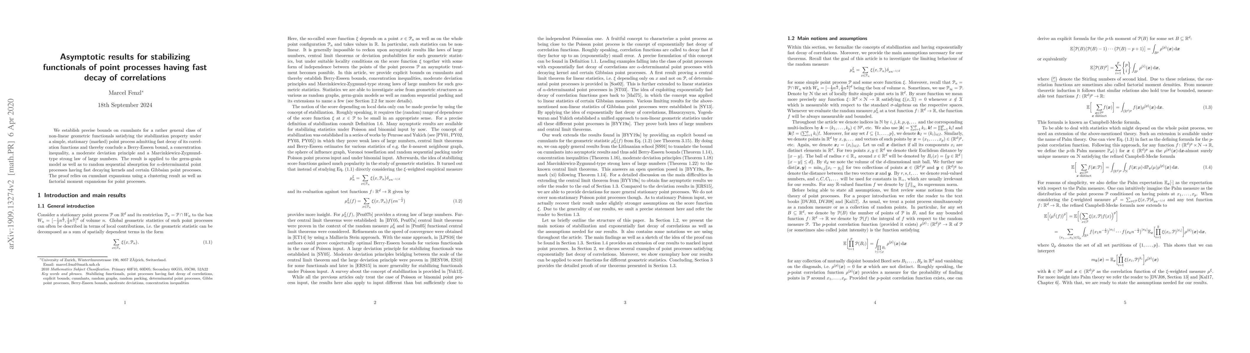 We establish precise bounds on cumulants for a rather general class of non-linear geometric functionals satisfying the stabilization property under a simple, stationary (marked) point process admitting fast decay of its correlation functions and thereby conclude a Berry-Esseen bound, a concentration inequality, a moderate deviation principle and a Marcinkiewicz-Zygmund-type strong law of large numbers. The result is applied to the germ-grain model as well as to random sequential absorption for ${\alpha}$-determinantal point processes having fast decaying kernels and certain Gibbsian point processes. The proof relies on cumulant expansions using a clustering result as well as factorial moment expansions for point processes.