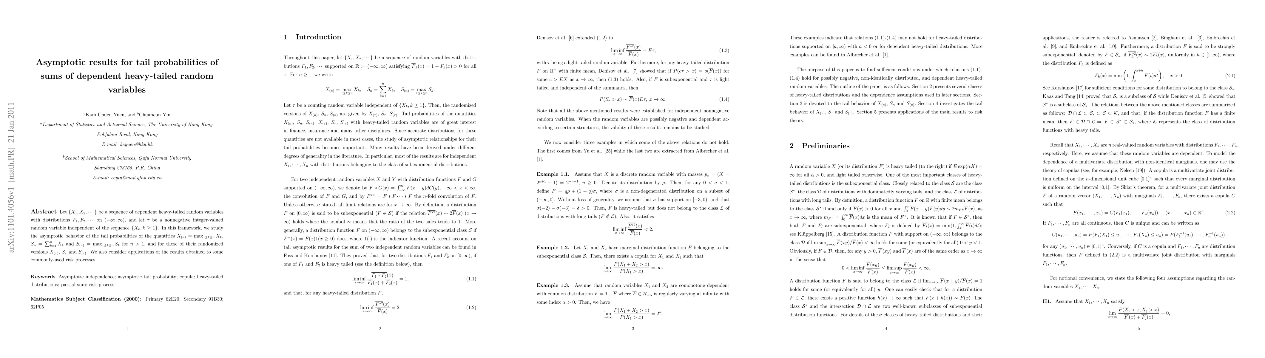 This paper investigates the asymptotic behavior of tail probabilities for sums and maxima of dependent heavy-tailed random variables, focusing on both deterministic and randomized versions of these quantities. Applications to risk processes are also explored.