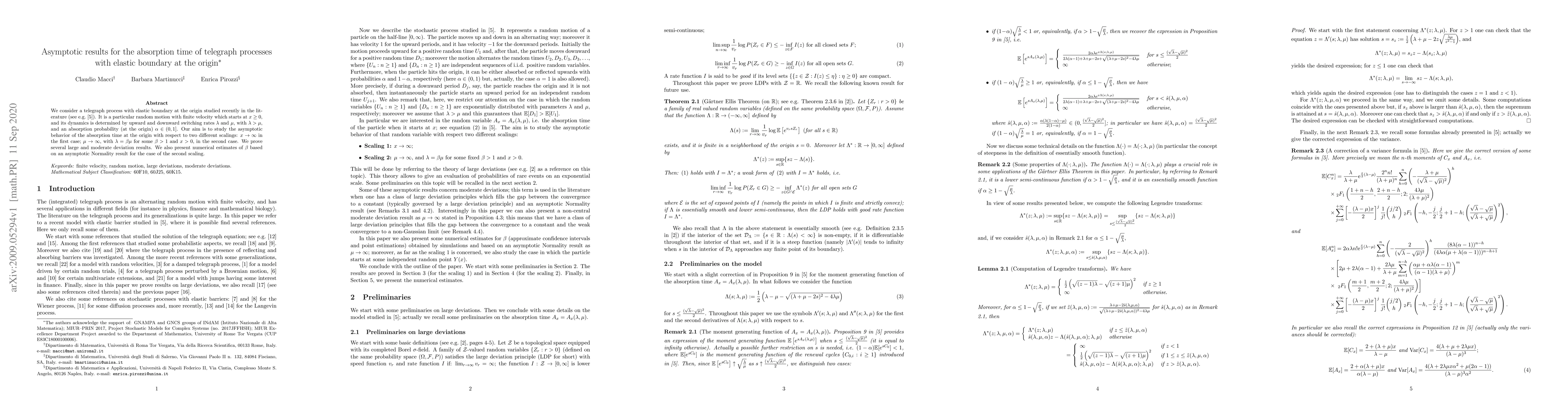 This research paper investigates the asymptotic behavior of absorption time in a telegraph process with elastic boundary at the origin, focusing on two scaling cases: x approaches infinity and mu approaches infinity with lambda proportional to mu.