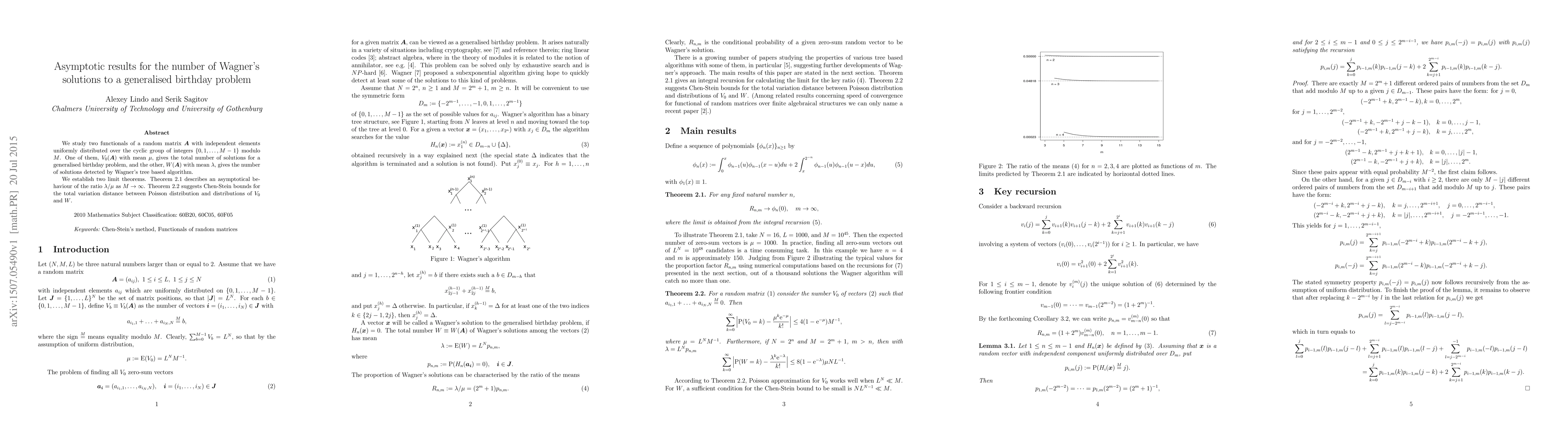 We study two functionals of a random matrix $\boldsymbol A$ with independent elements uniformly distributed over the cyclic group of integers $\{0,1,\ldots, M-1\}$ modulo $M$. One of them, $V_0(\boldsymbol A)$ with mean $\mu$, gives the total number of solutions for a generalised birthday problem, and the other, $W(\boldsymbol A)$ with mean $\lambda$, gives the number of solutions detected by Wagner's tree based algorithm. We establish two limit theorems. Theorem 2.1 describes an asymptotical behaviour of the ratio $\lambda/\mu$ as $M\to\infty$. Theorem 2.2 suggests Chen-Stein bounds for the total variation distance between Poisson distribution and distributions of $V_{0}$ and $W$.