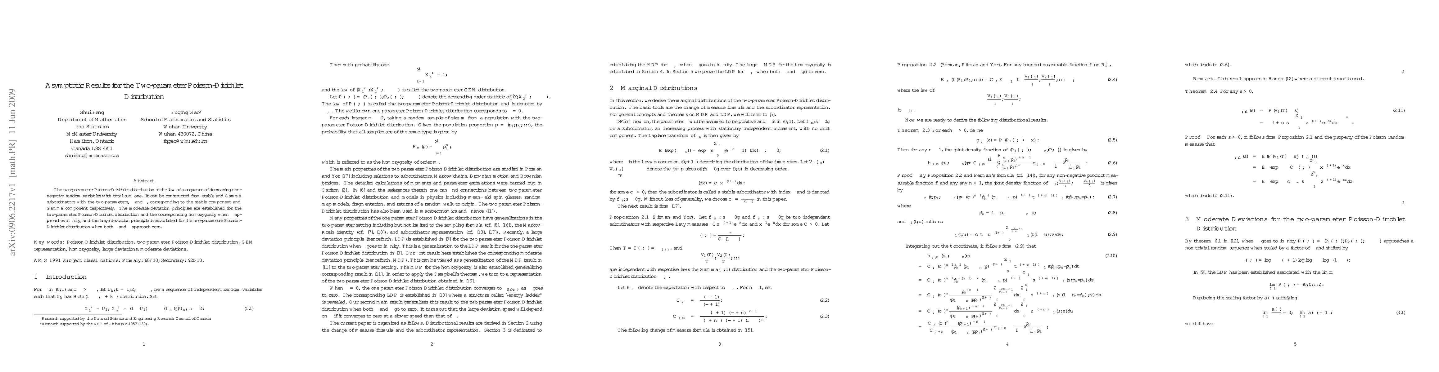 The two-parameter Poisson-Dirichlet distribution is the law of a sequence of decreasing nonnegative random variables with total sum one. It can be constructed from stable and Gamma subordinators with the two-parameters, $\alpha$ and $\theta$, corresponding to the stable component and Gamma component respectively. The moderate deviation principles are established for the two-parameter Poisson-Dirichlet distribution and the corresponding homozygosity when $\theta$ approaches infinity, and the large deviation principle is established for the two-parameter Poisson-Dirichlet distribution when both $\alpha$ and $\theta$ approach zero.