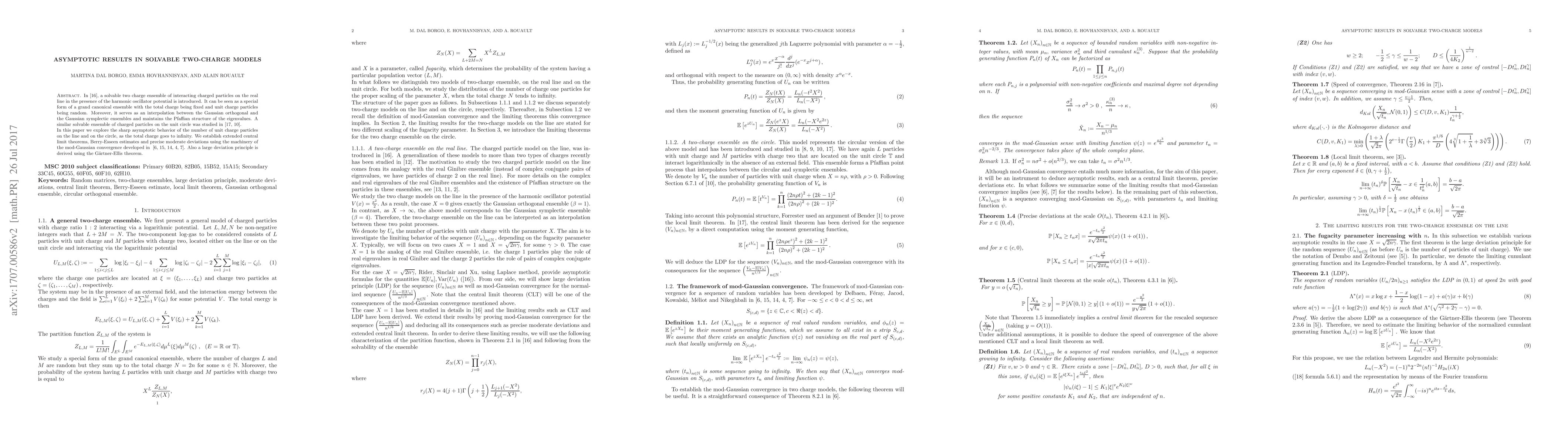 Rider, Sinclair and Xu (2013) introduced a solvable two charge ensemble of interacting charged particles on the real line in the presence of the harmonic oscillator potential. It can be seen as a special form of a grand canonical ensemble with the total charge being fixed and unit charge particles being random. Moreover, it serves as an interpolation between the Gaussian orthogonal and the Gaussian symplectic ensembles and maintains the Pfaffian structure of the eigenvalues. A similar solvable ensemble of charged particles on the unit circle was studied by Shum and Sinclair (2014) and Forrester (2010). In this paper we explore the sharp asymptotic behavior of the number of unit charge particles on the line and on the circle, as the total charge goes to infinity. We establish extended central limit theorems, Berry-Esseen estimates and precise moderate deviations using the machinery of the mod-Gaussian convergence. Also a large deviation principle is derived using the G\"artner-Ellis theorem.