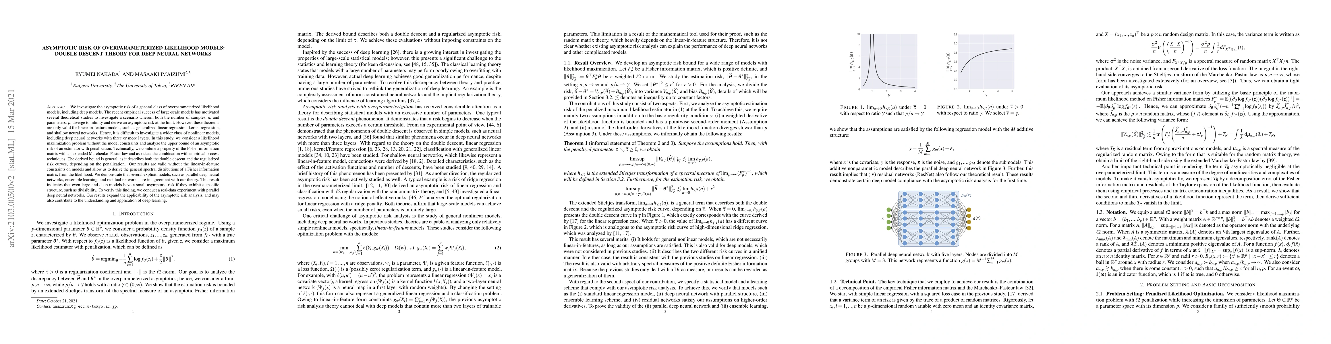 We investigate the asymptotic risk of a general class of overparameterized likelihood models, including deep models. The recent empirical success of large-scale models has motivated several theoretical studies to investigate a scenario wherein both the number of samples, $n$, and parameters, $p$, diverge to infinity and derive an asymptotic risk at the limit. However, these theorems are only valid for linear-in-feature models, such as generalized linear regression, kernel regression, and shallow neural networks. Hence, it is difficult to investigate a wider class of nonlinear models, including deep neural networks with three or more layers. In this study, we consider a likelihood maximization problem without the model constraints and analyze the upper bound of an asymptotic risk of an estimator with penalization. Technically, we combine a property of the Fisher information matrix with an extended Marchenko-Pastur law and associate the combination with empirical process techniques. The derived bound is general, as it describes both the double descent and the regularized risk curves, depending on the penalization. Our results are valid without the linear-in-feature constraints on models and allow us to derive the general spectral distributions of a Fisher information matrix from the likelihood. We demonstrate that several explicit models, such as parallel deep neural networks, ensemble learning, and residual networks, are in agreement with our theory. This result indicates that even large and deep models have a small asymptotic risk if they exhibit a specific structure, such as divisibility. To verify this finding, we conduct a real-data experiment with parallel deep neural networks. Our results expand the applicability of the asymptotic risk analysis, and may also contribute to the understanding and application of deep learning.