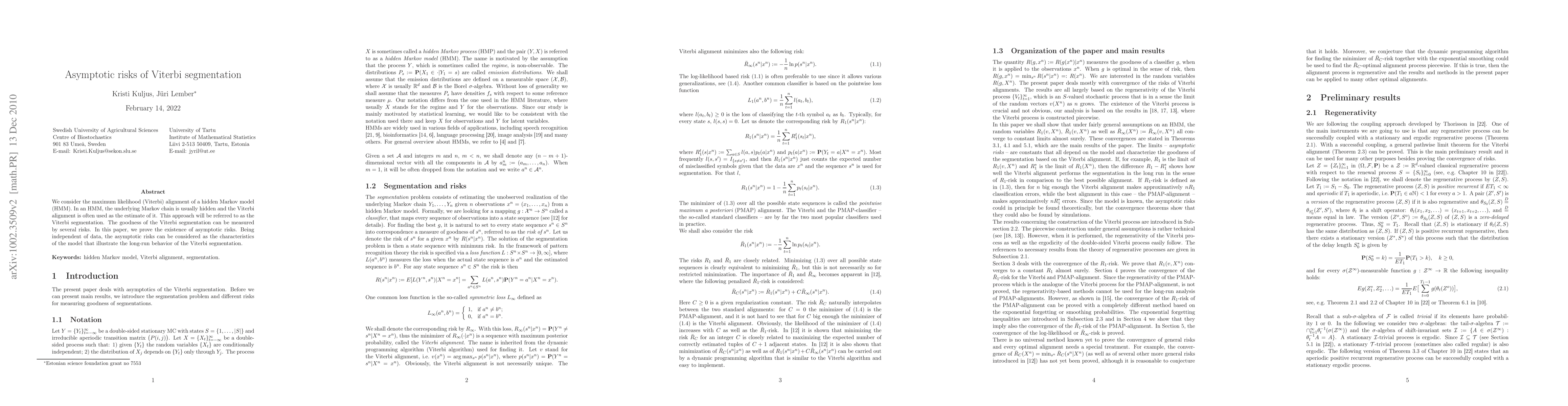 The paper presents a theoretical analysis of the Viterbi segmentation in hidden Markov models (HMMs), focusing on the asymptotic risks of this approach.