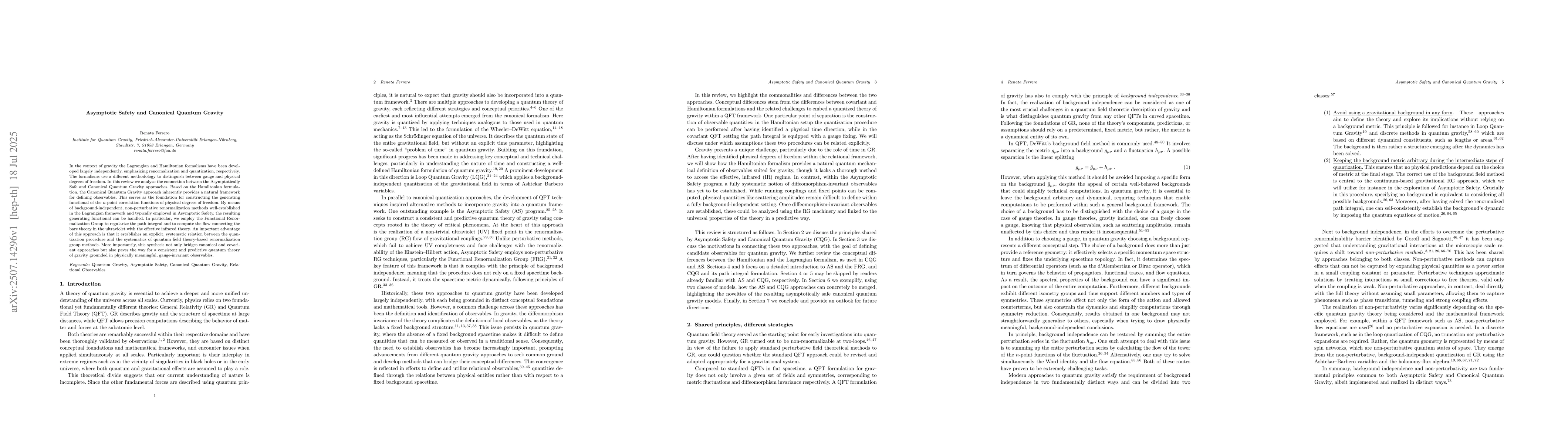 In the context of gravity the Lagrangian and Hamiltonian formalisms have been developed largely independently, emphasizing renormalization and quantization, respectively. The formalisms use a different methodology to distinguish between gauge and physical degrees of freedom. In this review we analyze the connection between the Asymptotically Safe and Canonical Quantum Gravity approaches. Based on the Hamiltonian formulation, the Canonical Quantum Gravity approach inherently provides a natural framework for defining observables. This serves as the foundation for constructing the generating functional of the $n$-point correlation functions of physical degrees of freedom. By means of background-independent, non-perturbative renormalization methods well-established in the Lagrangian framework and typically employed in Asymptotic Safety, the resulting generating functional can be handled. In particular, we employ the Functional Renormalization Group to regularize the path integral and to compute the flow connecting the bare theory in the ultraviolet with the effective infrared theory. An important advantage of this approach is that it establishes an explicit, systematic relation between the quantization procedure and the systematics of quantum field theory-based renormalization group methods. More importantly, this synthesis not only bridges canonical and covariant approaches but also paves the way for a consistent and predictive quantum theory of gravity grounded in physically meaningful, gauge-invariant observables.