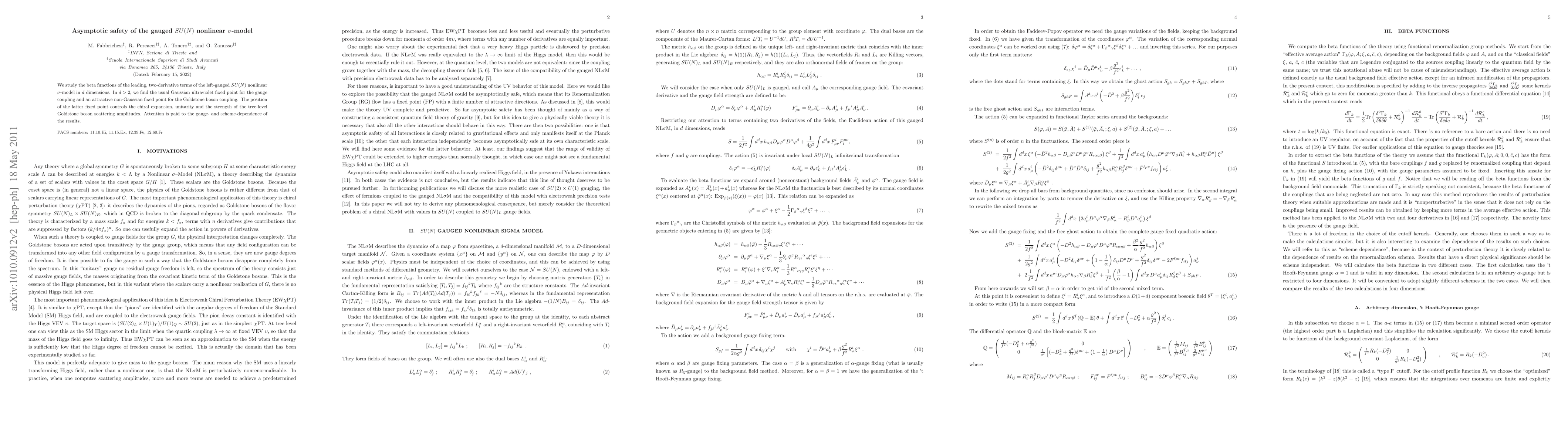 We study the beta functions of the leading, two-derivative terms of the left-gauged SU(N) nonlinear sigma-model in d dimensions. In d>2, we find the usual Gaussian ultraviolet fixed point for the gauge coupling and an attractive non-Gaussian fixed point for the Goldstone boson coupling. The position of the latter fixed point controls the chiral expansion, unitarity and the strength of the tree-level Goldstone boson scattering amplitudes. Attention is paid to the gauge- and scheme-dependence of the results.