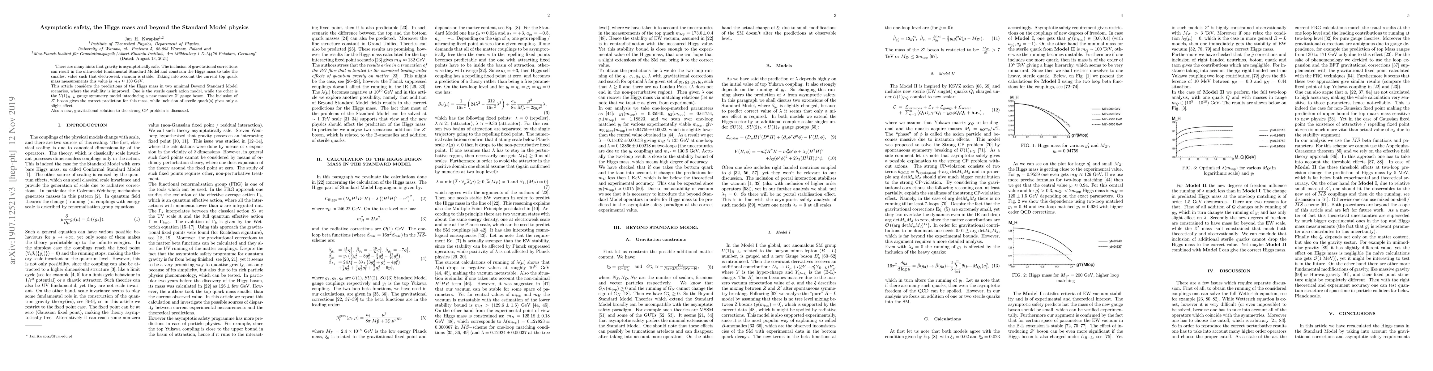 This paper explores the asymptotic safety of gravity and its implications for the Standard Model, predicting a Higgs mass of approximately 130 GeV for electroweak vacuum stability. It also examines two Beyond Standard Model scenarios—the sterile quark axion model and the $U(1)_{B-L}$ gauge symmetry model—and discusses a gravitational solution to the strong CP problem.