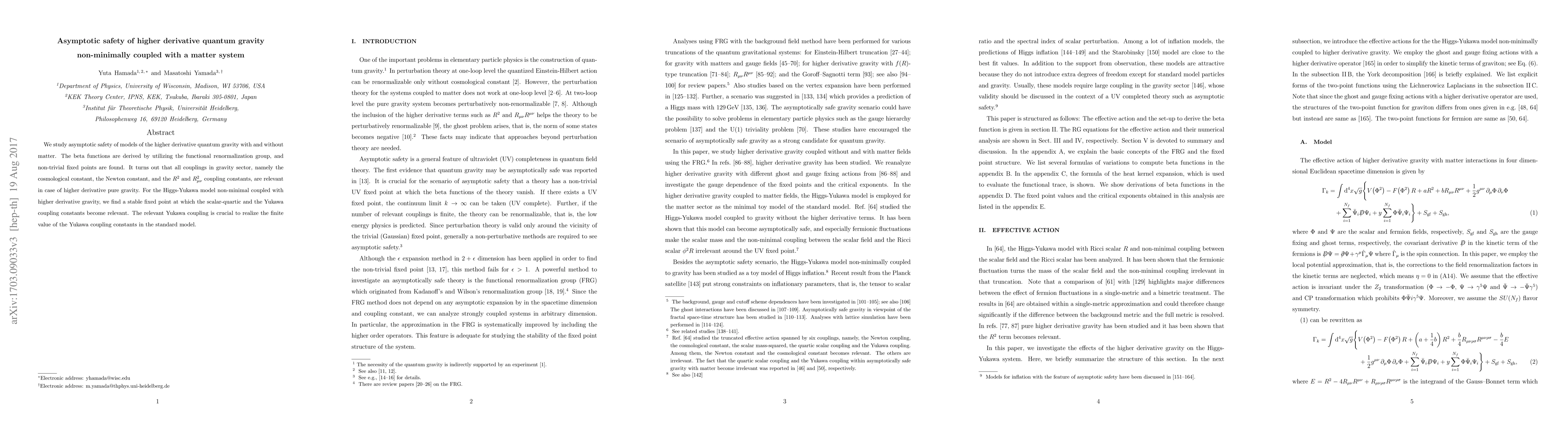 This paper investigates the asymptotic safety of higher derivative quantum gravity, both with and without matter, using the functional renormalization group. It finds that in pure gravity, all higher derivative couplings are relevant, while in the Higgs-Yukawa model coupled with higher derivative gravity, a stable fixed point emerges where the scalar-quartic and Yukawa couplings become relevant, crucial for maintaining finite Yukawa coupling constants in the standard model.