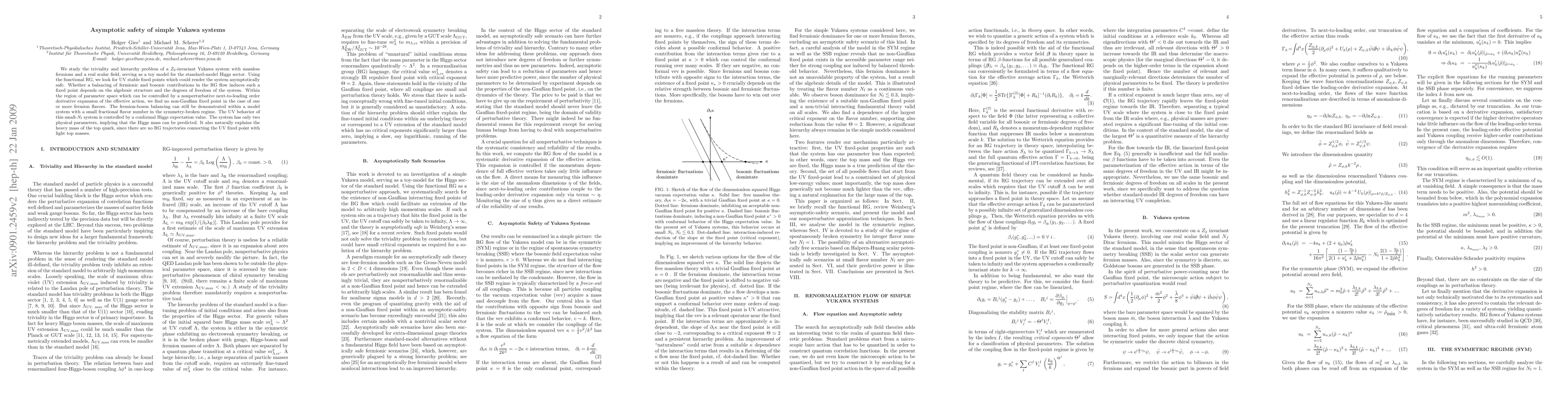 We study the triviality and hierarchy problem of a Z_2-invariant Yukawa system with massless fermions and a real scalar field, serving as a toy model for the standard-model Higgs sector. Using the functional RG, we look for UV stable fixed points which could render the system asymptotically safe. Whether a balancing of fermionic and bosonic contributions in the RG flow induces such a fixed point depends on the algebraic structure and the degrees of freedom of the system. Within the region of parameter space which can be controlled by a nonperturbative next-to-leading order derivative expansion of the effective action, we find no non-Gaussian fixed point in the case of one or more fermion flavors. The fermion-boson balancing can still be demonstrated within a model system with a small fractional flavor number in the symmetry-broken regime. The UV behavior of this small-N_f system is controlled by a conformal Higgs expectation value. The system has only two physical parameters, implying that the Higgs mass can be predicted. It also naturally explains the heavy mass of the top quark, since there are no RG trajectories connecting the UV fixed point with light top masses.