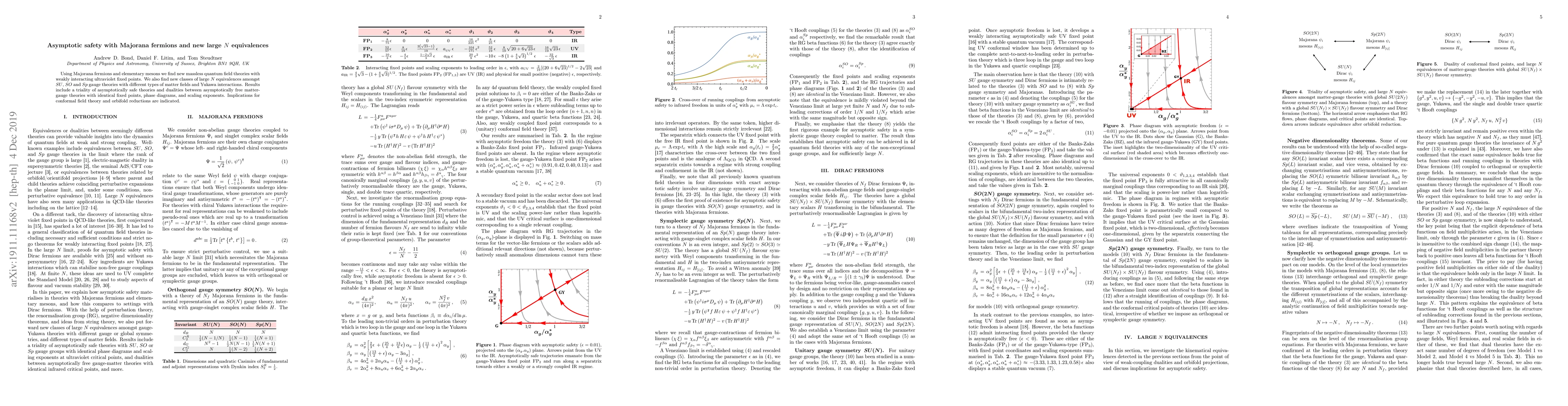 Using Majorana fermions and elementary mesons we find new massless quantum field theories with weakly interacting ultraviolet fixed points. We also find new classes of large N equivalences amongst SU, SO and Sp gauge theories with different types of matter fields and Yukawa interactions. Results include a triality of asymptotically safe theories and dualities between asymptotically free matter-gauge theories with identical fixed points, phase diagrams, and scaling exponents. Implications for conformal field theory and orbifold reductions are indicated.