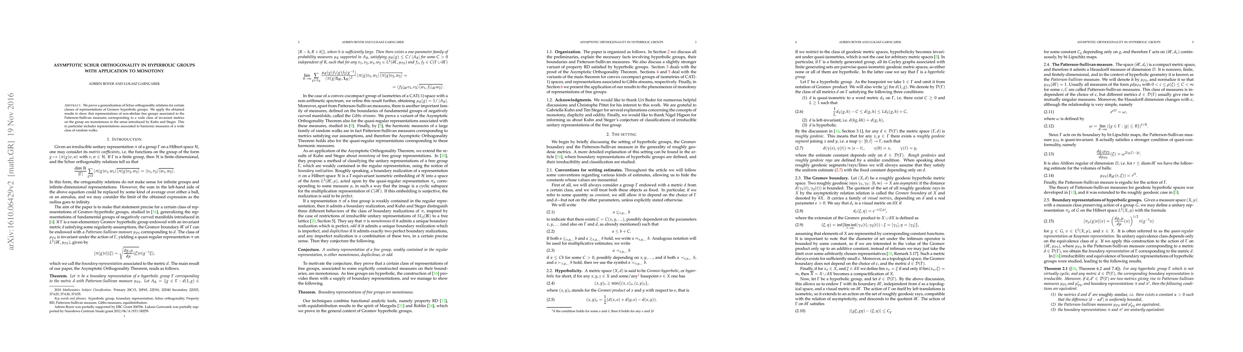 We prove a generalization of Schur orthogonality relations for certain classes of representations of Gromov hyperbolic groups. We apply the obtained results to show that representations of non-abelian free groups associated to the Patterson-Sullivan measures corresponding to a wide class of invariant metrics on the group are monotonous in the sense introduced by Kuhn and Steger. This in particular includes representations associated to harmonic measures of a wide class of random walks.